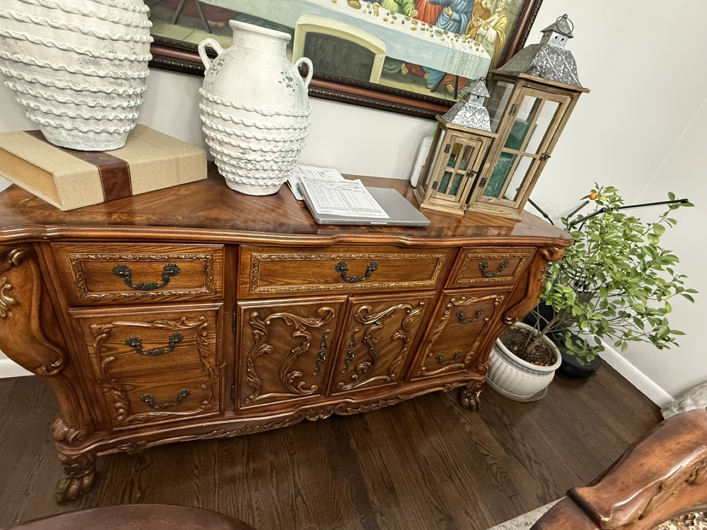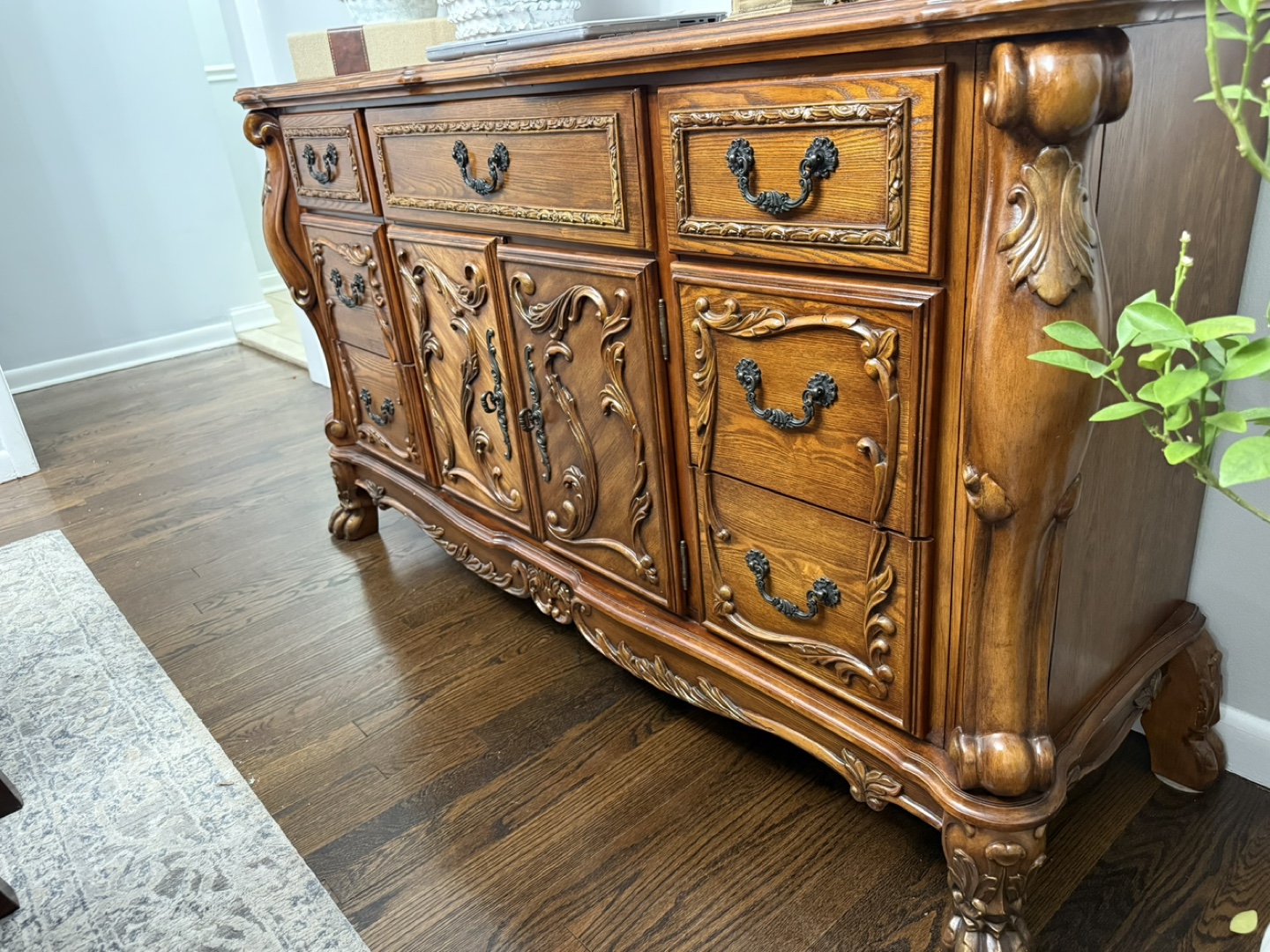 Beautiful ornate wood dresser/buffet with lots of storage! It's in great condition and would look great in any home.