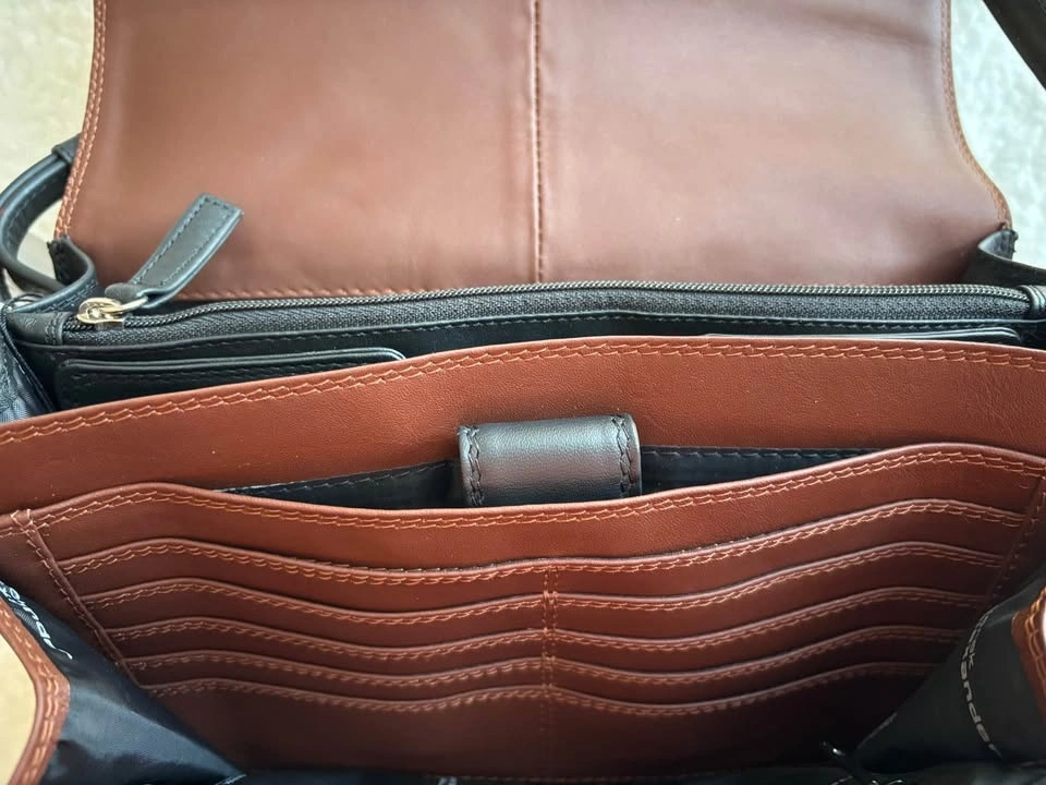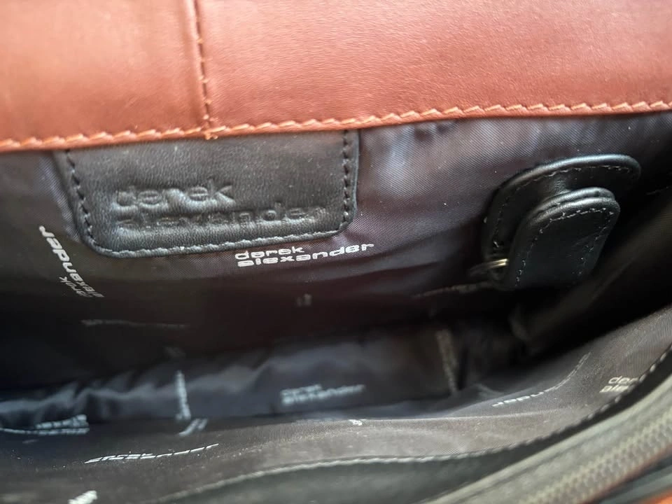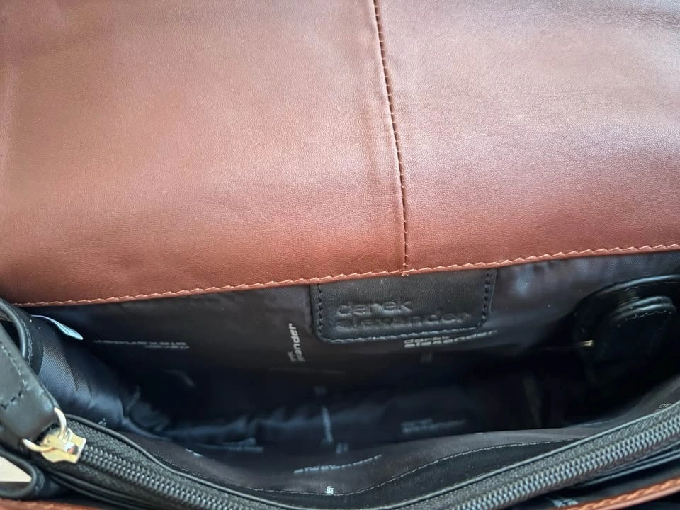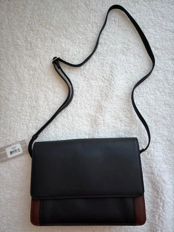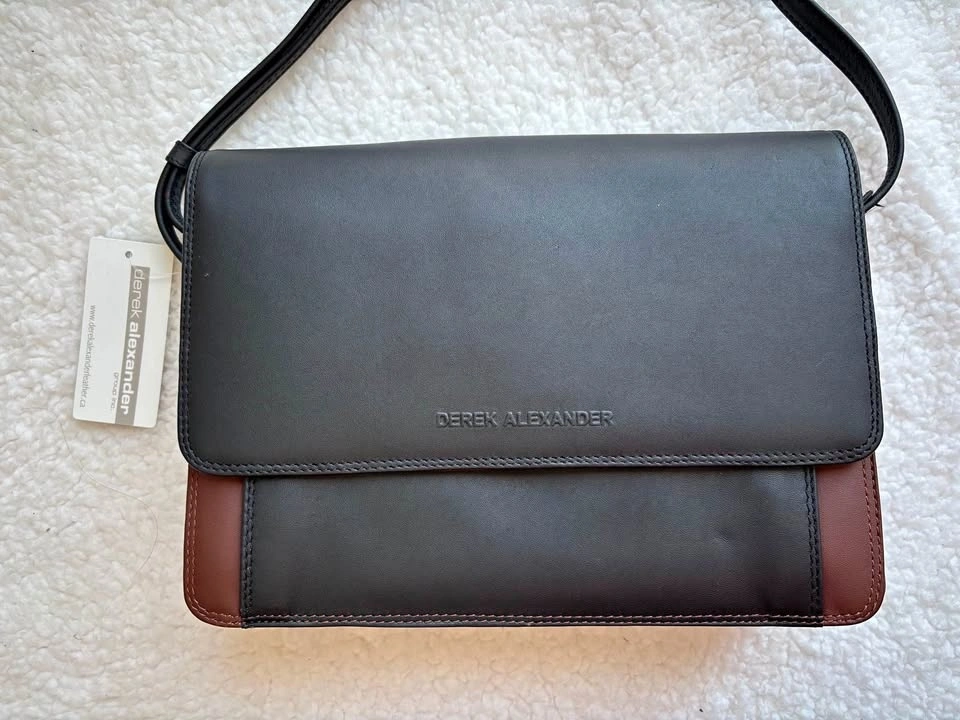 Brand new with tags. Derek Alexander unisex organizer crossbody bag in black/brown leather. Dimensions are 24x17x6-8 cm (expandable). Feel free to message if you have any questions!