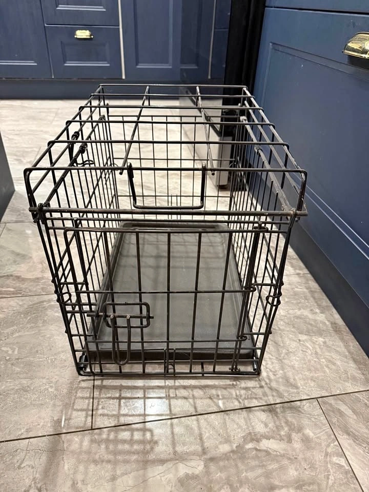 Compact and sturdy metal dog crate, perfect for small breeds and puppies. Includes removable plastic tray for easy cleaning. Size: Small (ideal for small breeds & puppies). Durable black metal frame. Front door with secure latch. Removable bottom tray (easy to clean). Folds flat for storage or transport. Very good β clean and ready to use. Perfect for crate training, travel, or creating a cozy safe space at home.