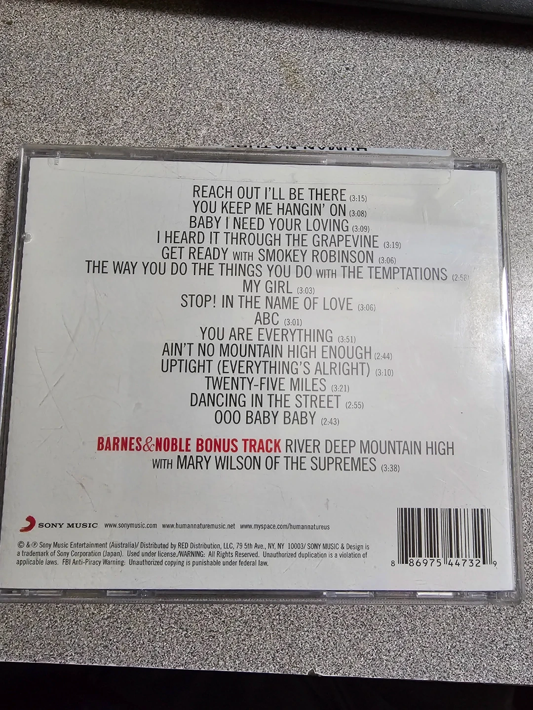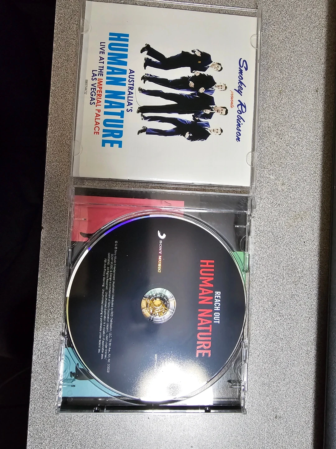 Human Nature's 'Reach Out' CD includes tracks like "Reach Out I'll Be There" and "Get Ready" featuring Smokey Robinson. Also features a bonus track with Mary Wilson of The Supremes. Sony Music release.