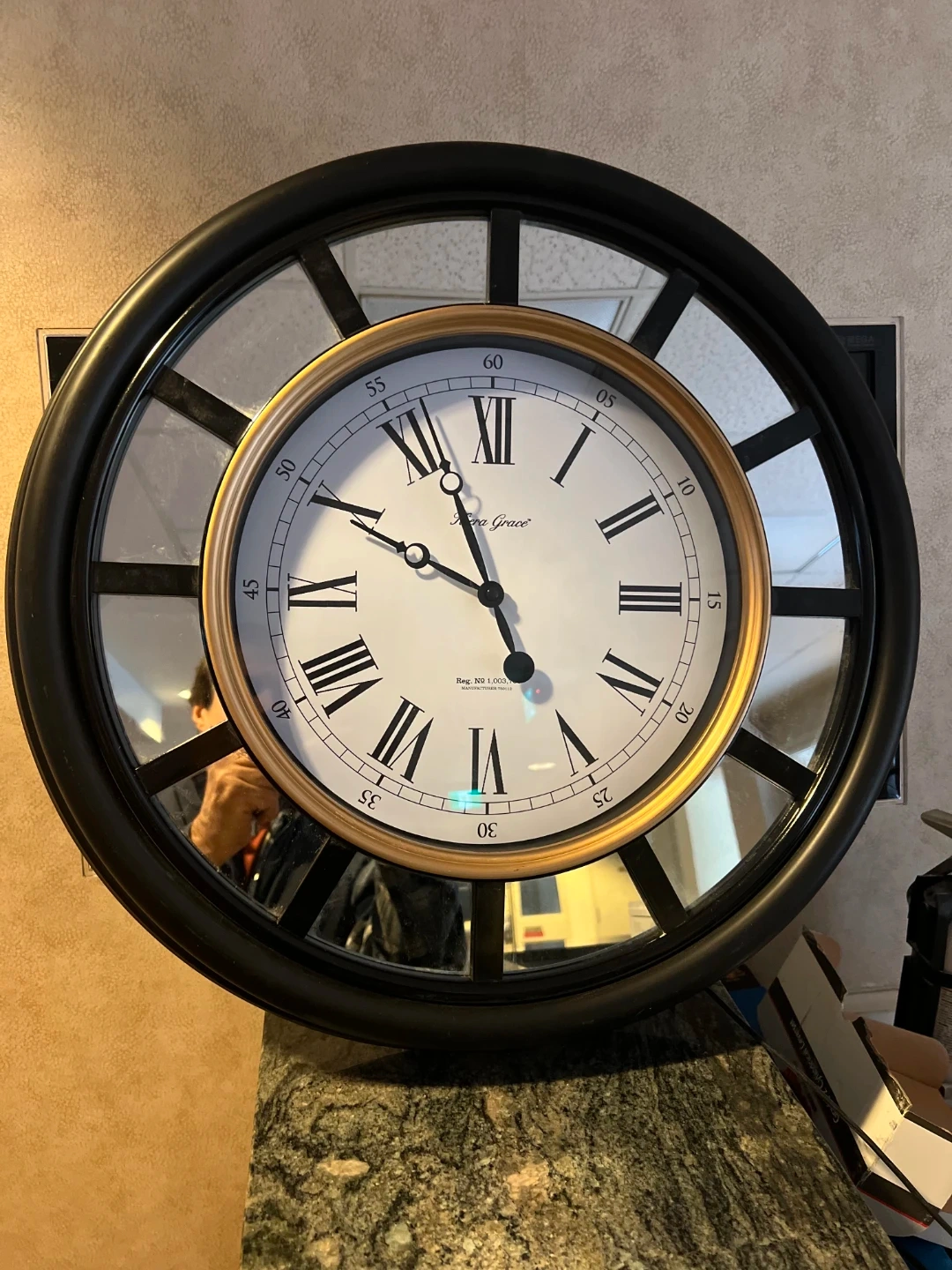 This Kera Grace wall clock features a classic Roman numeral dial. It has a mirrored outer frame with black accents. Battery operated.