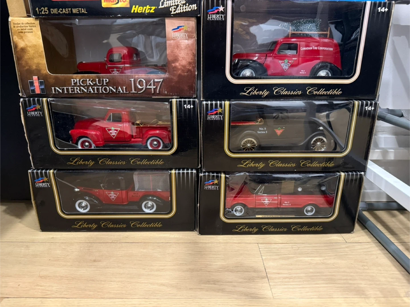 Collection of Liberty Classics die-cast metal trucks, 1:25 scale. Includes a 1947 International Pick-Up and a Canadian Tire Corporation delivery truck. These are detailed collectible models.