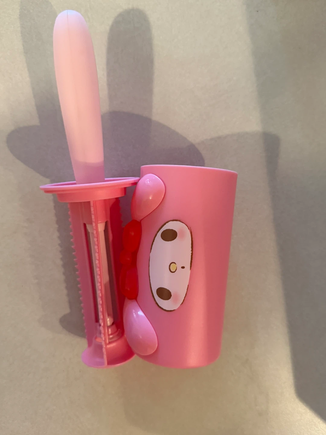 This cute pink lint roller features a playful character design with ears and a bow. It's perfect for quickly removing lint and pet hair from clothing. The roller has a durable plastic handle and a protective cover for the sticky surface.