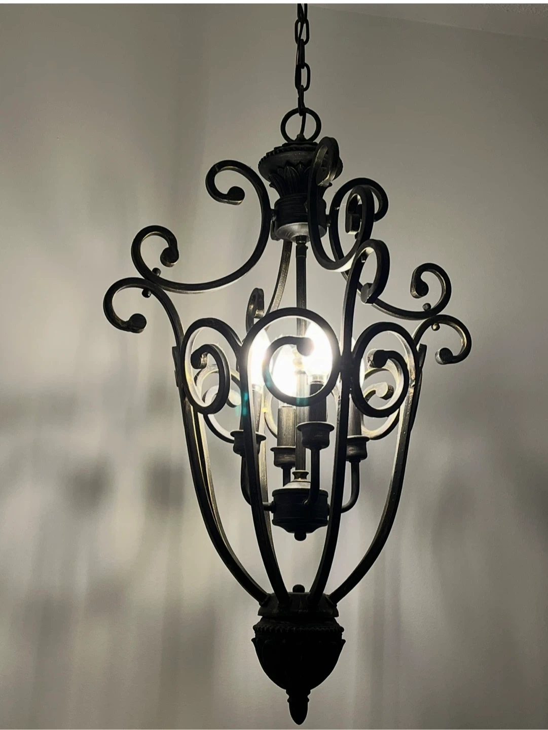 This black metal chandelier adds a touch of classic elegance to any room. It features ornate scrollwork and holds four bulbs for ample lighting. Its design makes it suitable for entryways or dining areas. 24”L, inside diameter 11”, outside diameter 18”