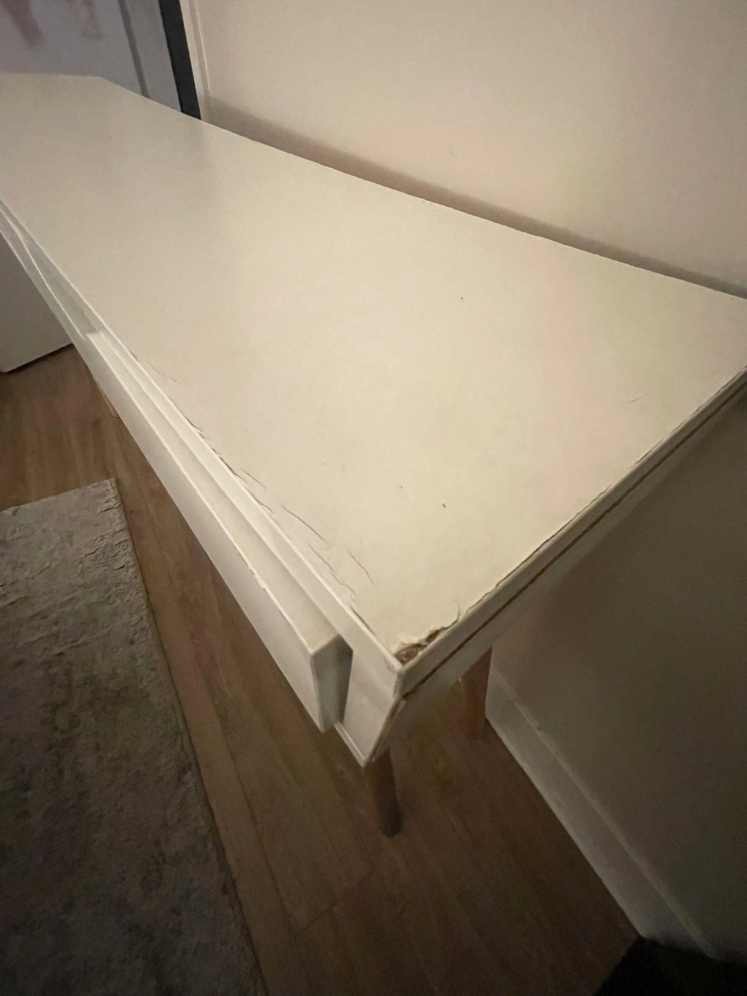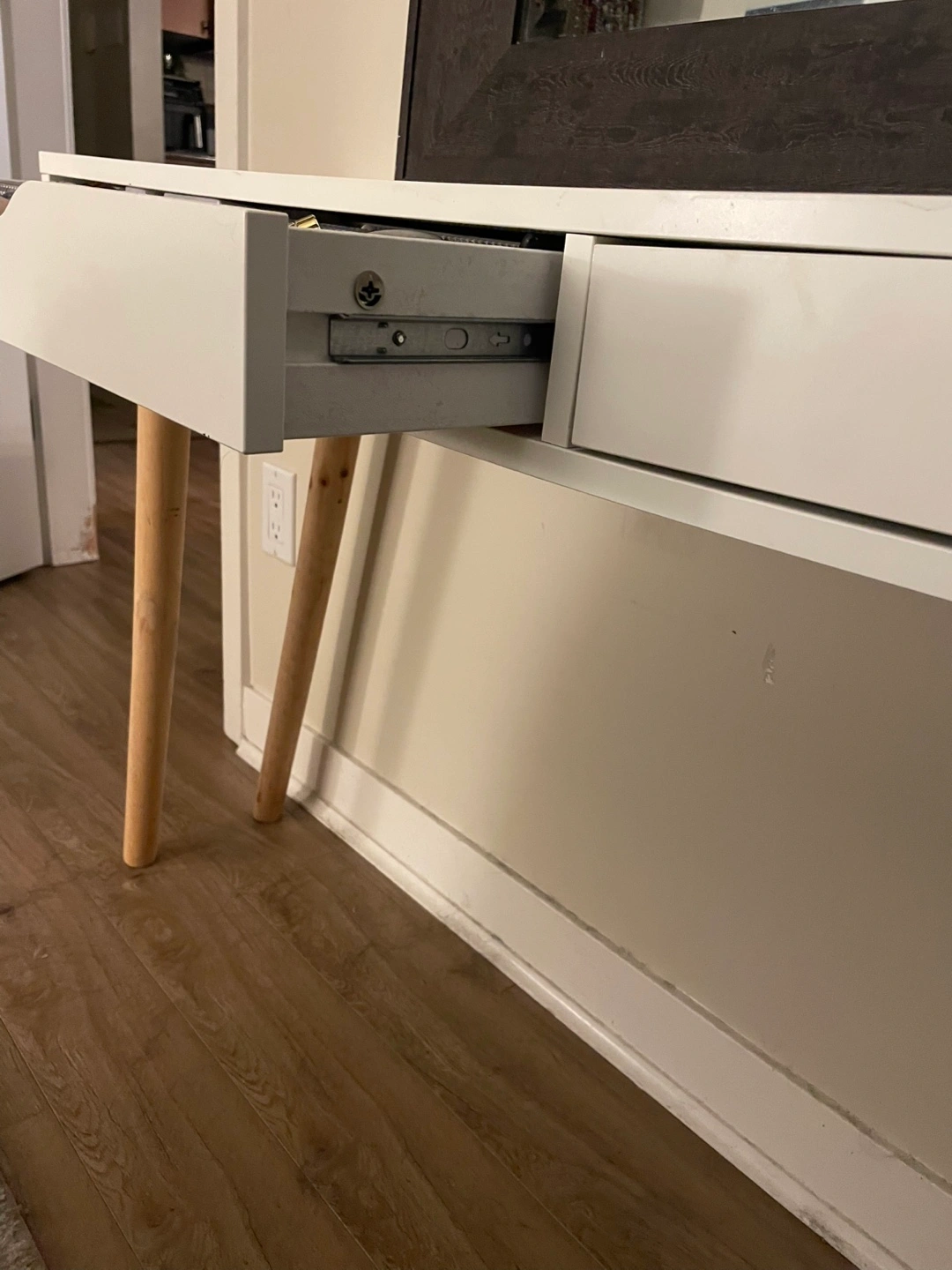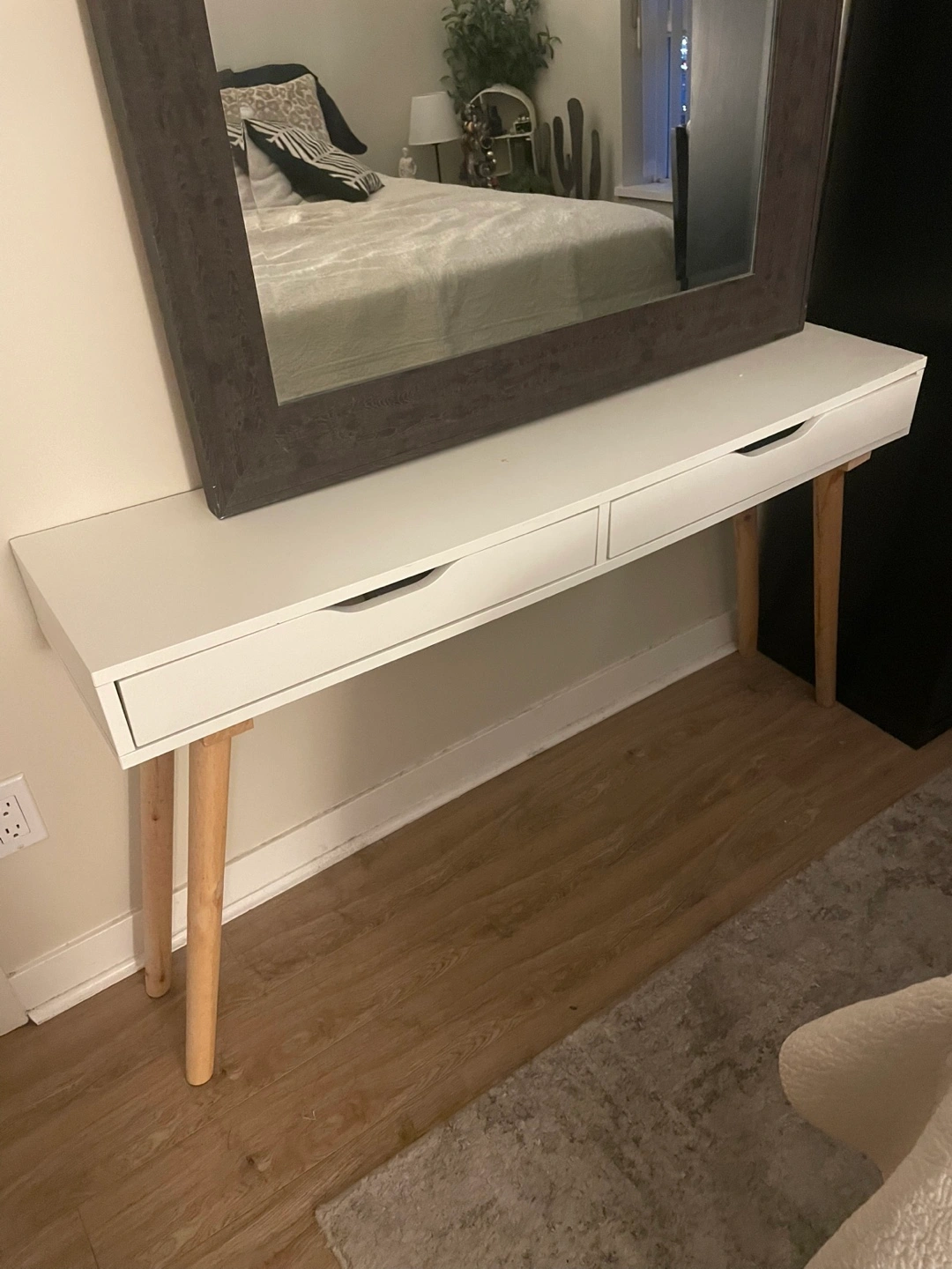 Selling a white vanity desk with two drawers. Simple, clean design with wooden legs. Perfect for a bedroom or dressing area! Little bit wobbly due to the length of the legs and how narrow it is