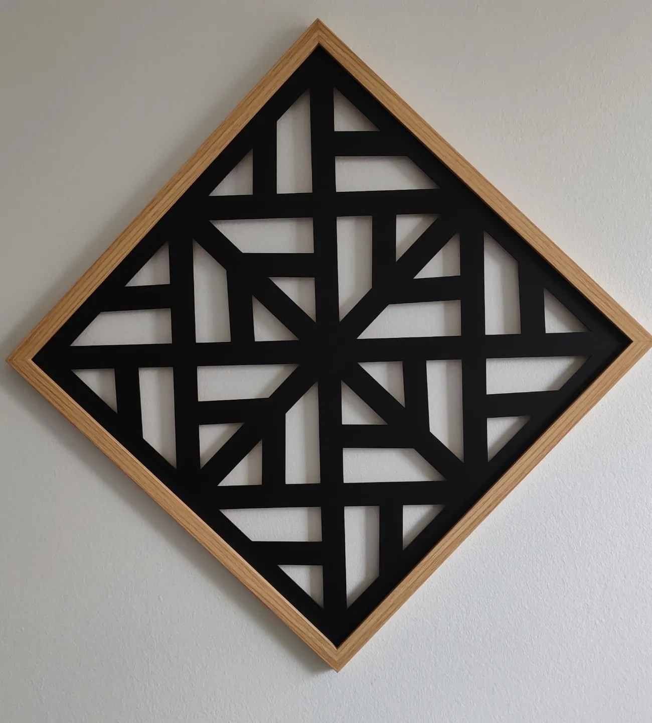 Decorative wall art featuring a geometric design within a natural wood frame. Black panel with cut-out patterns. It's a nice accent piece for any room!