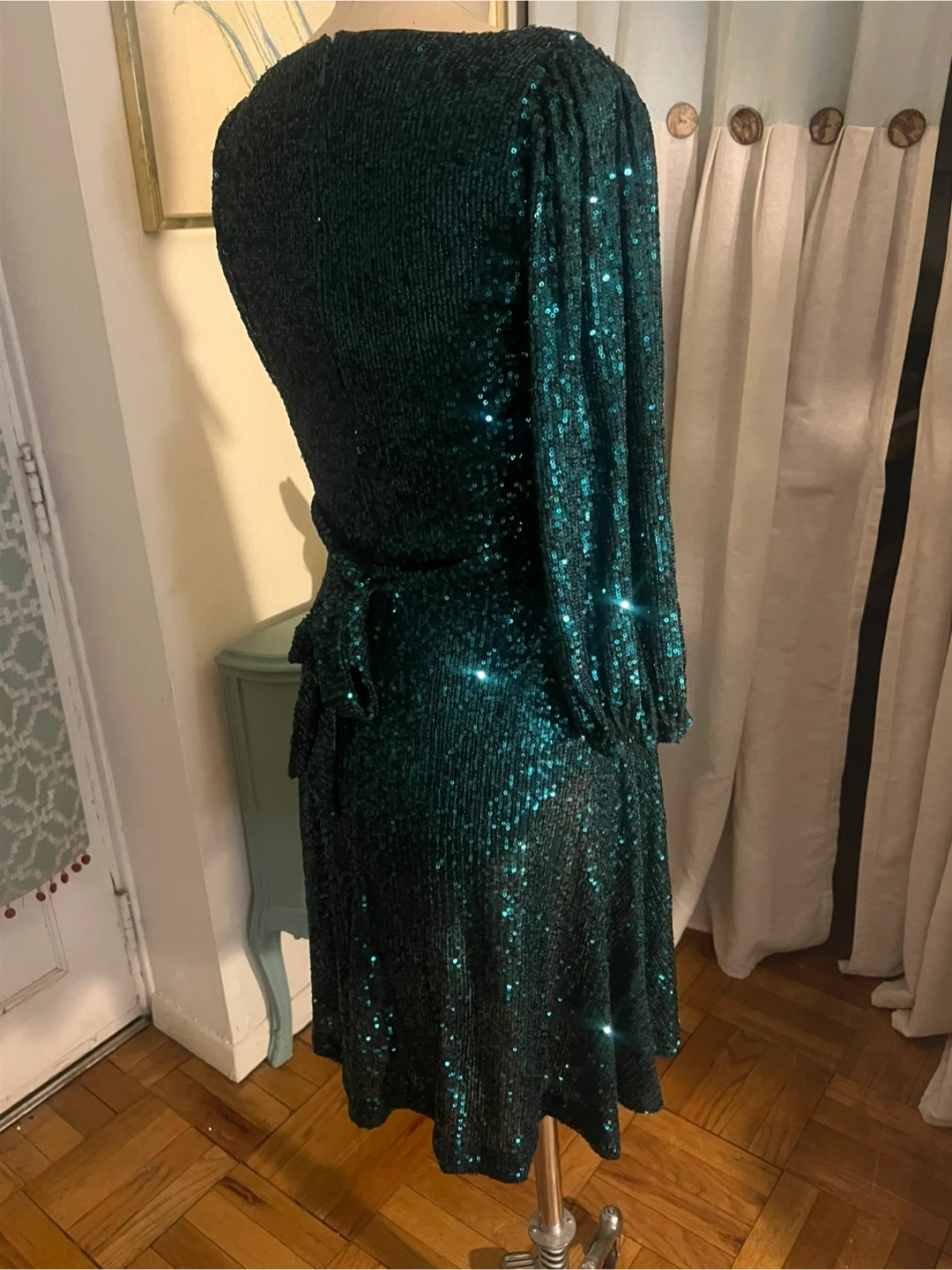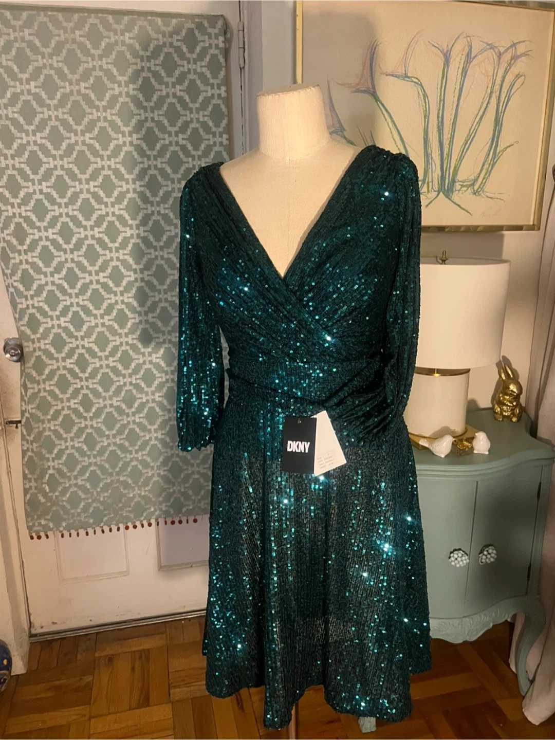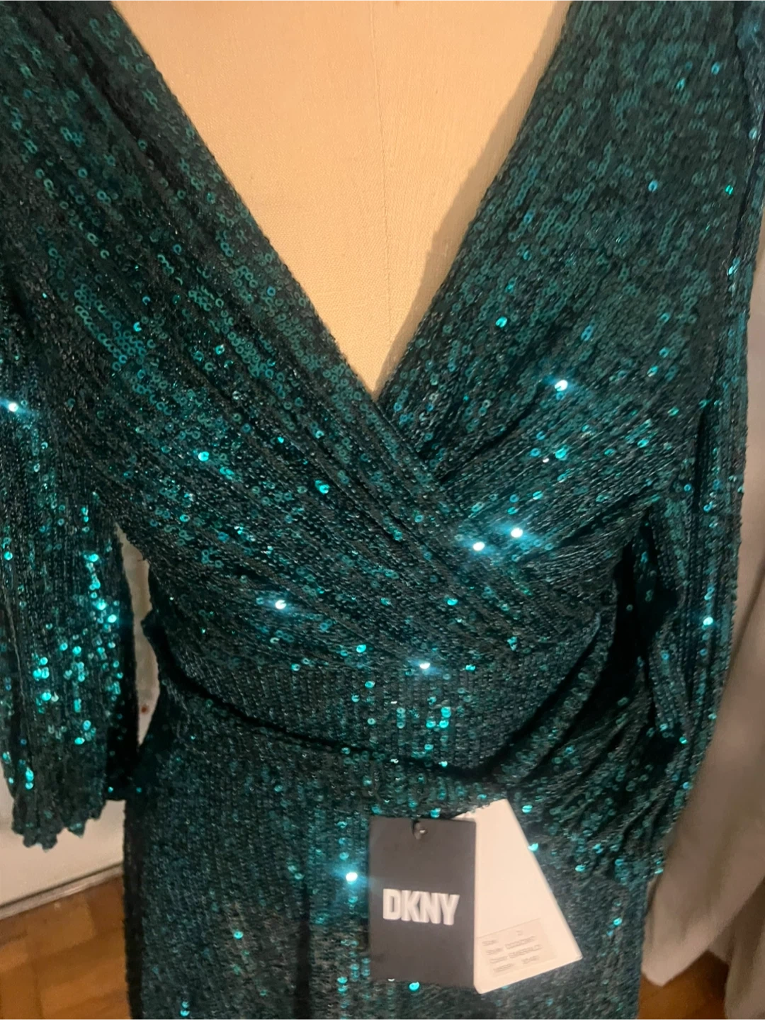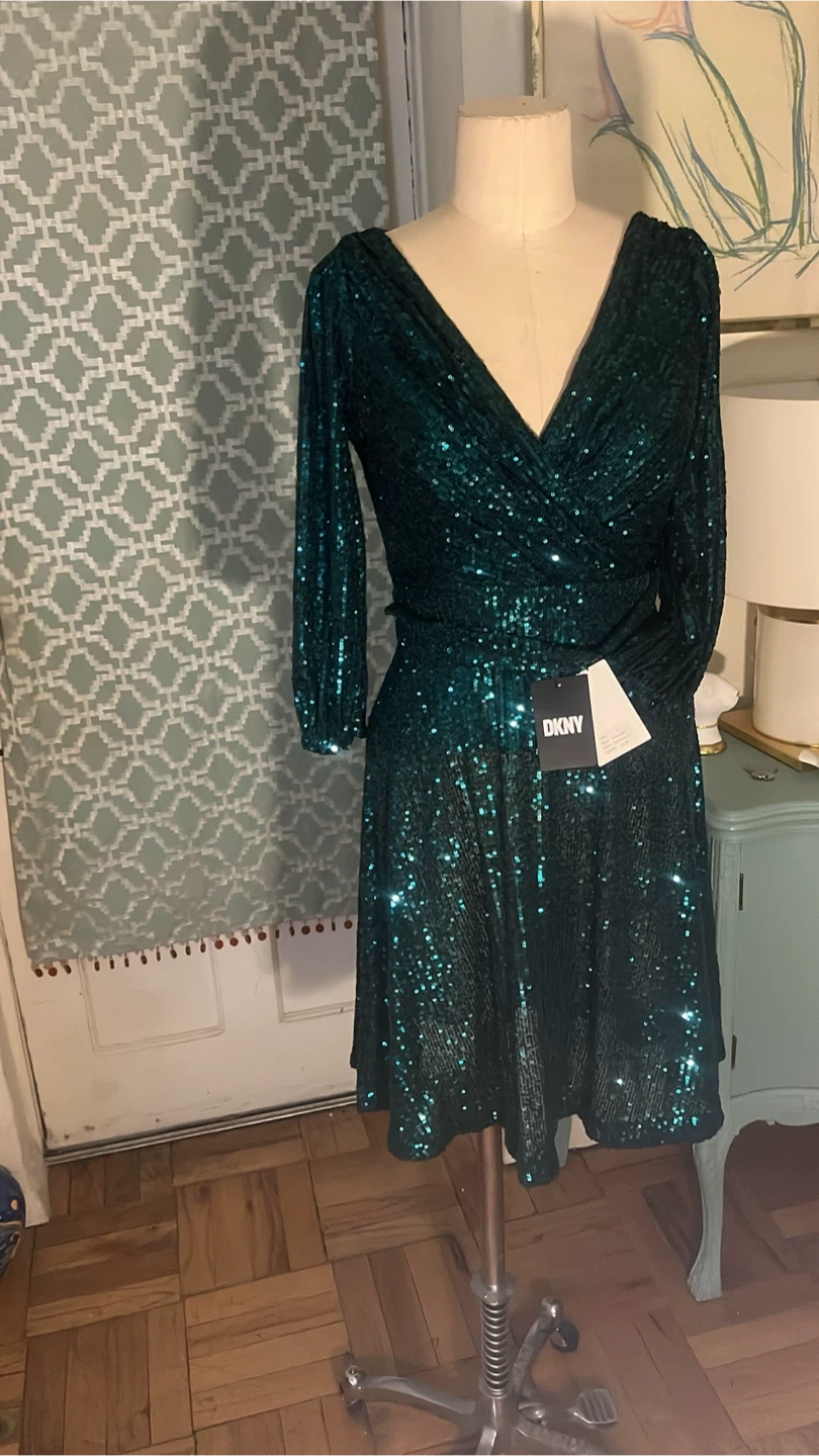 This DKNY dress is a showstopper! It's a beautiful emerald green with sequins that catch the light. It's a size 2 and has a flattering wrap style. The style number is DD2IZ967. The dress originally retailed for $149