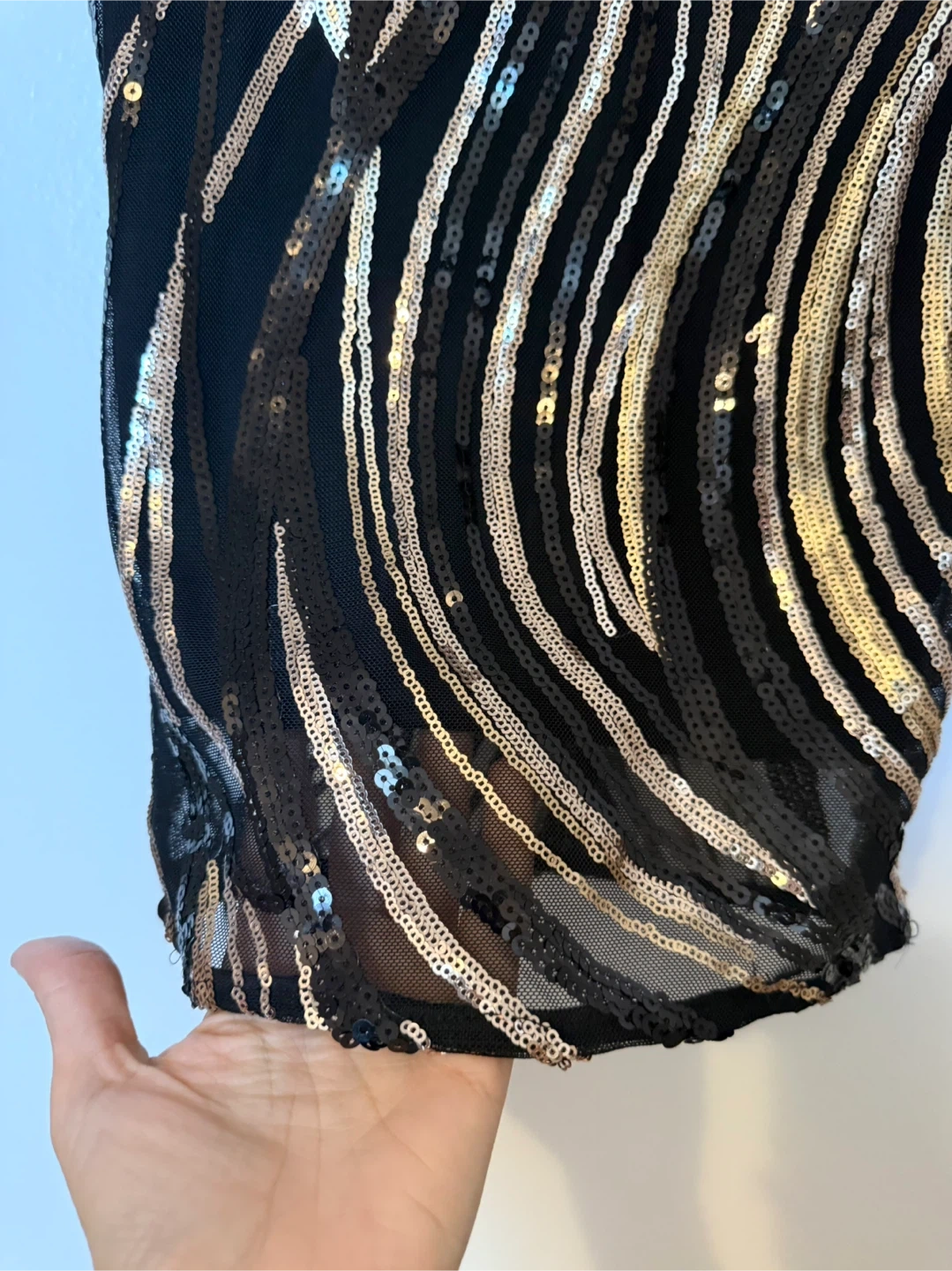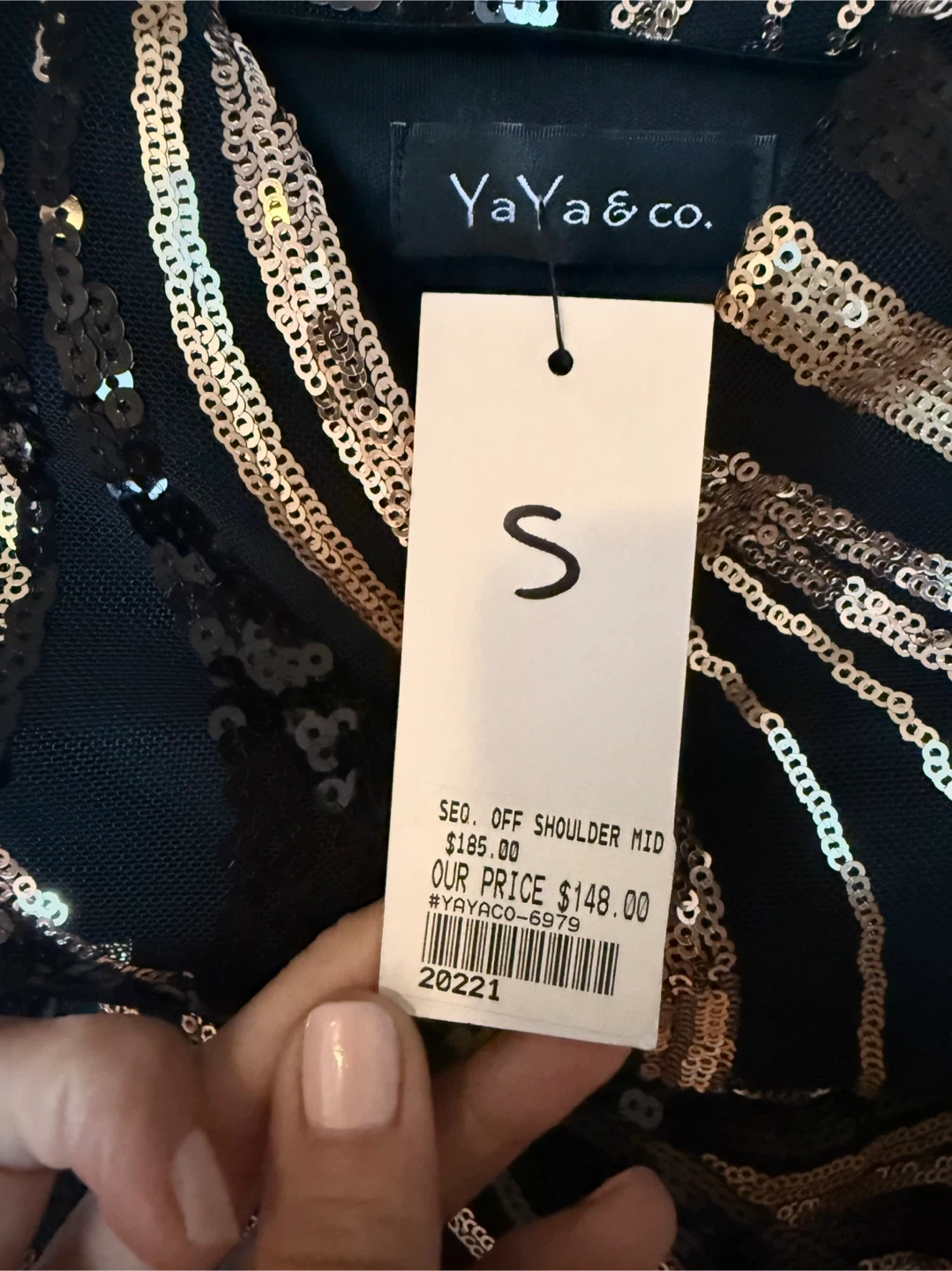Selling a beautiful YaYa&Co. sequin off-shoulder midi dress! It's a size small and features stunning black and gold sequins. The original price tag shows $185.00, but it was on sale for $148.00. This dress is perfect for a night out or any special occasion!