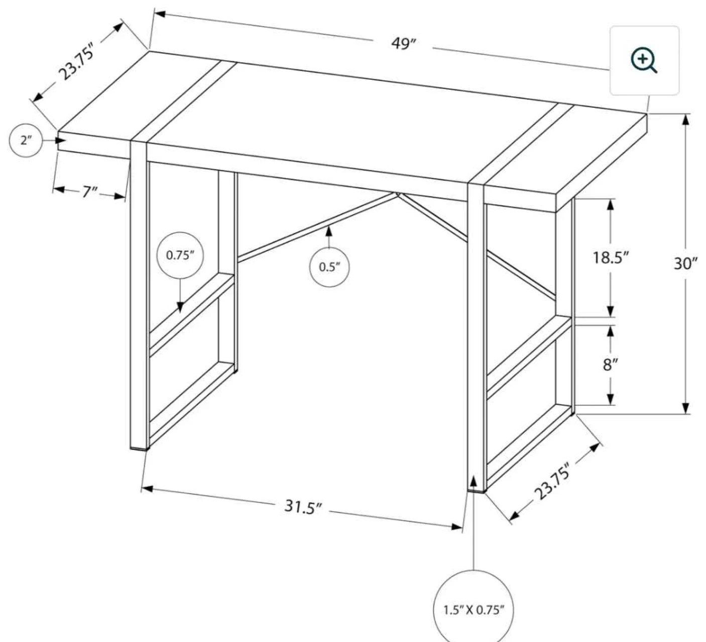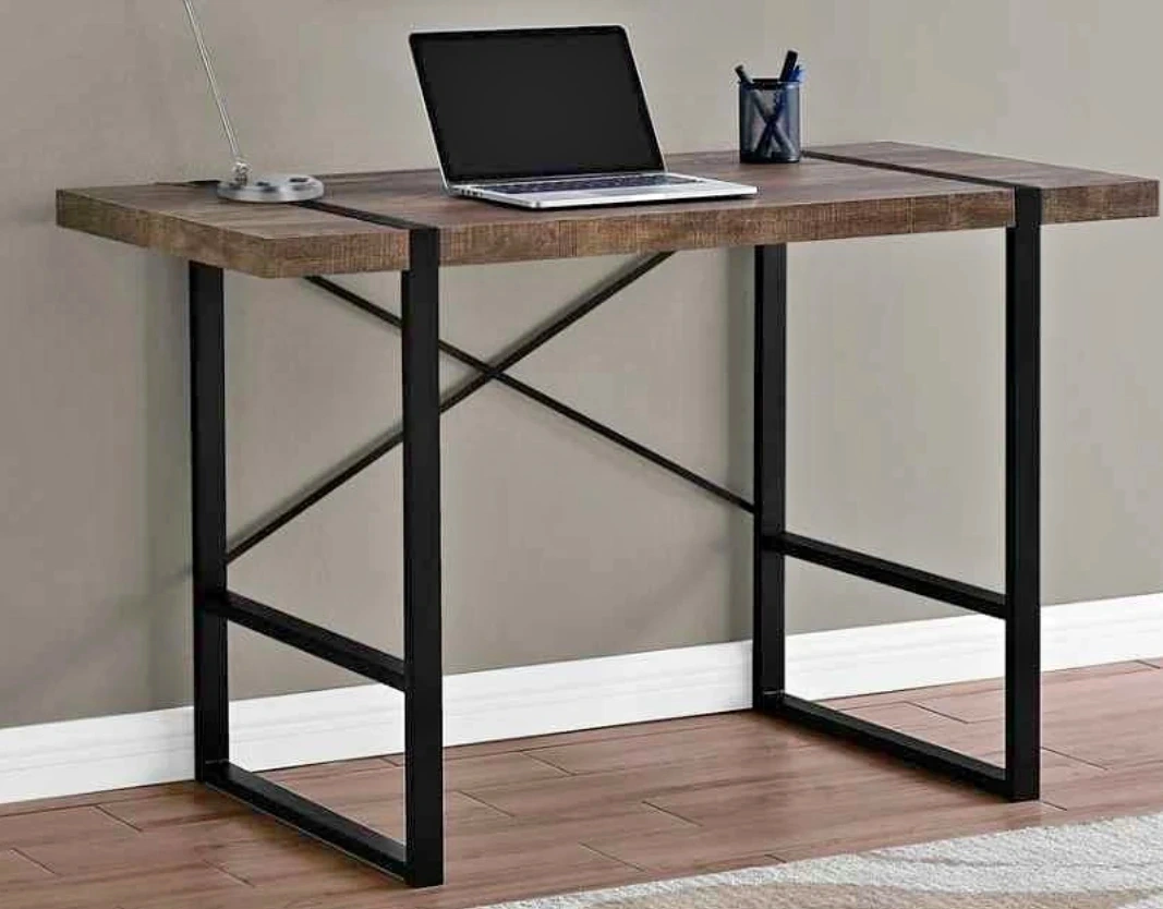 I have brand new in box Monarch computer desk. This computer desk is 49" L x 23.75" D x 30" H. It's constructed with a brown reclaimed wood look top and a black metal frame. The desk is 2 inches thick on top.