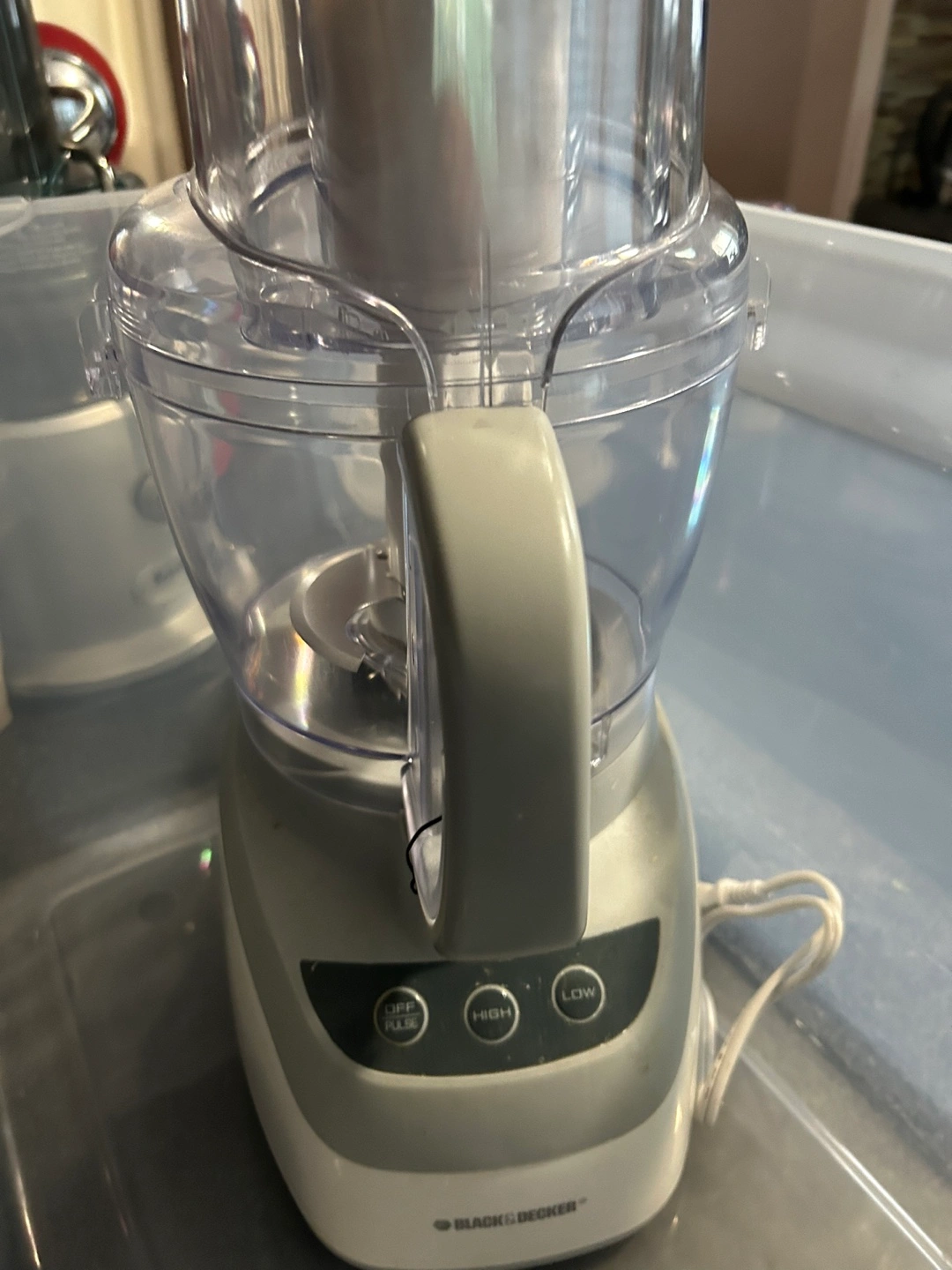 Small food processor. White and grey. Three speed settings: low, pulse, high. Includes work bowl and blade.