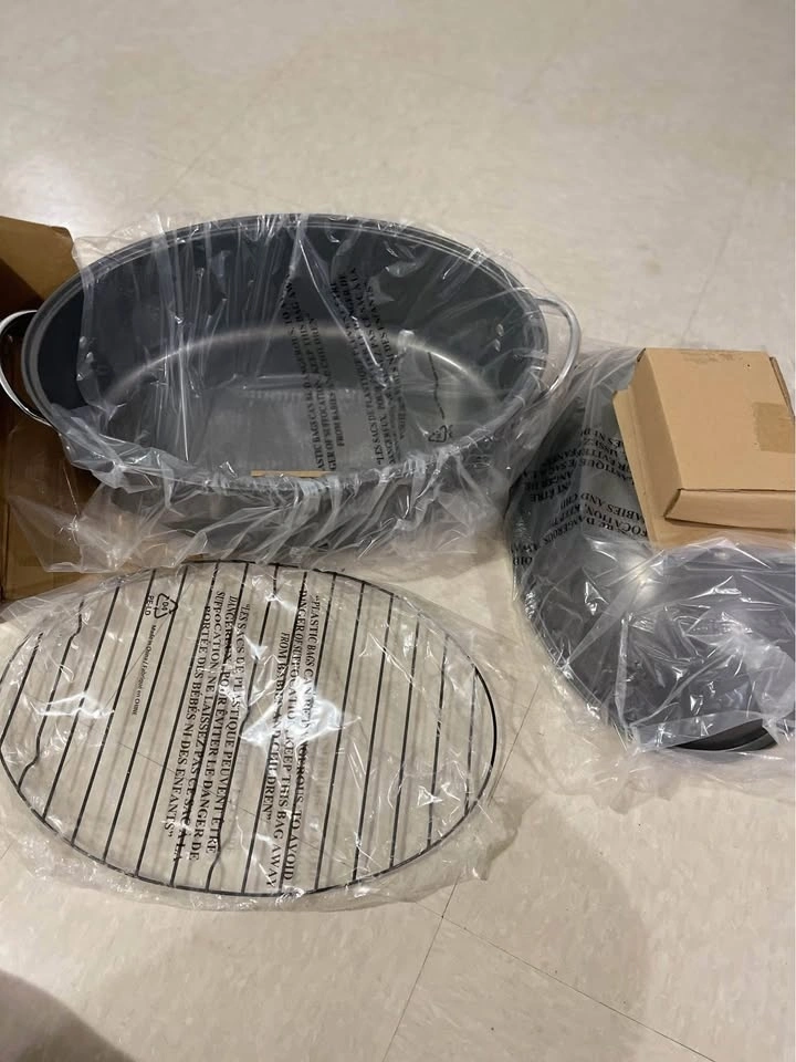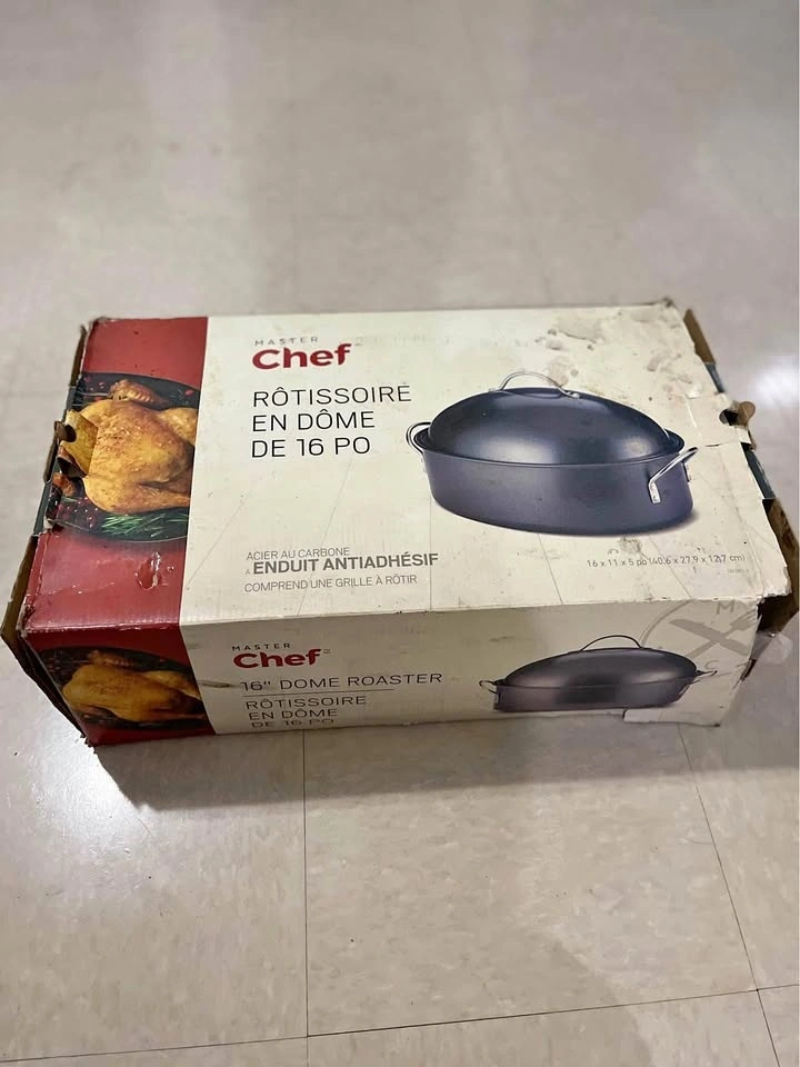 The box looks old because it was stored in the garage, but the roaster is brand new and has never been used. Originally purchased from Canadian Tire.