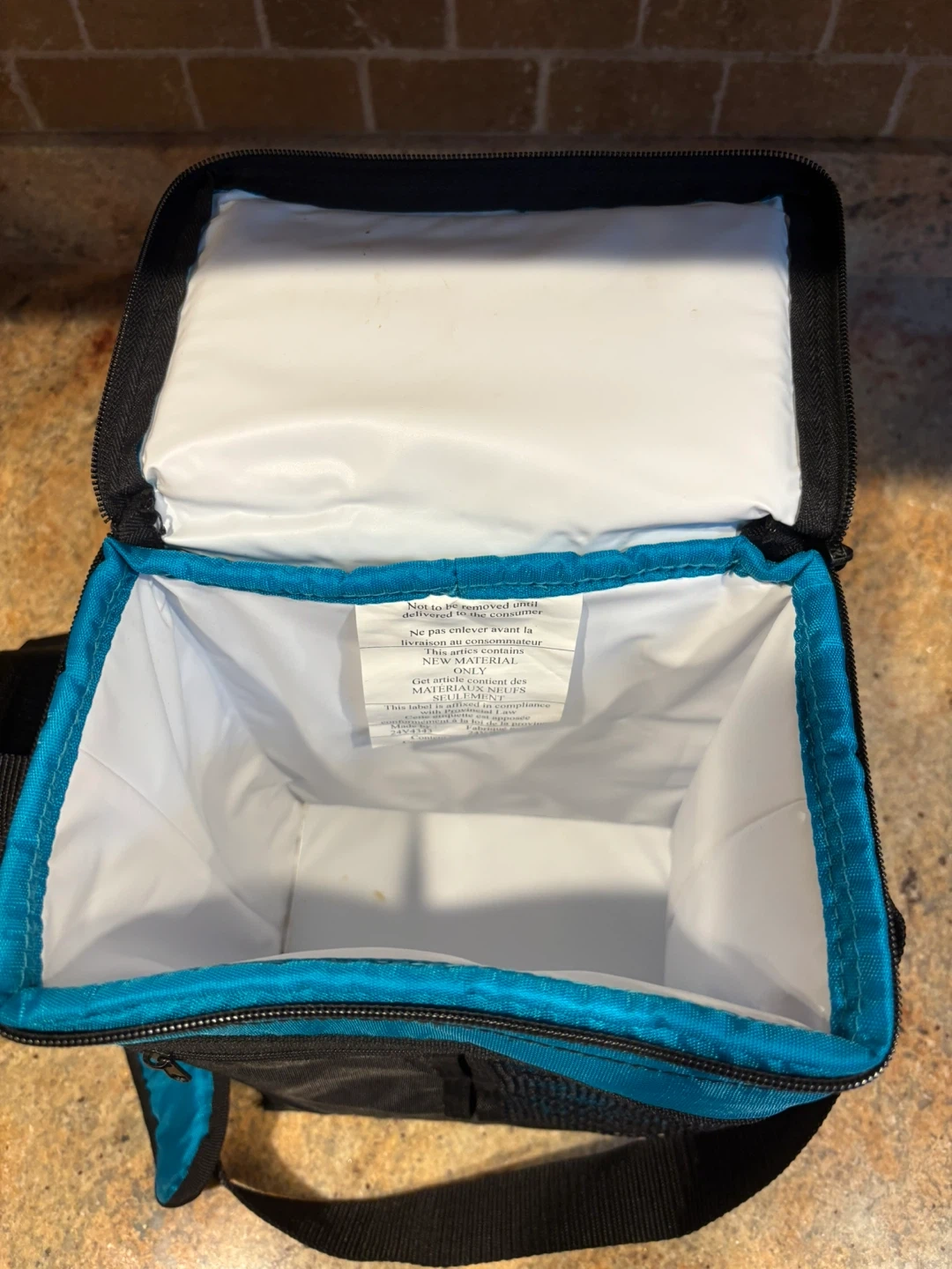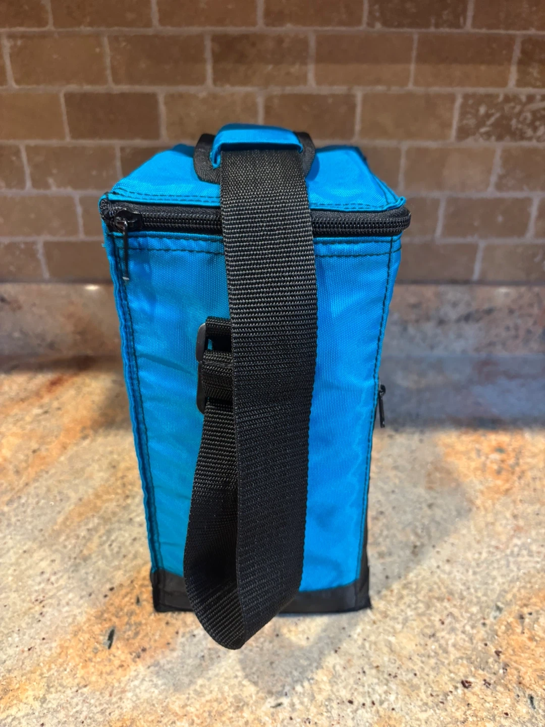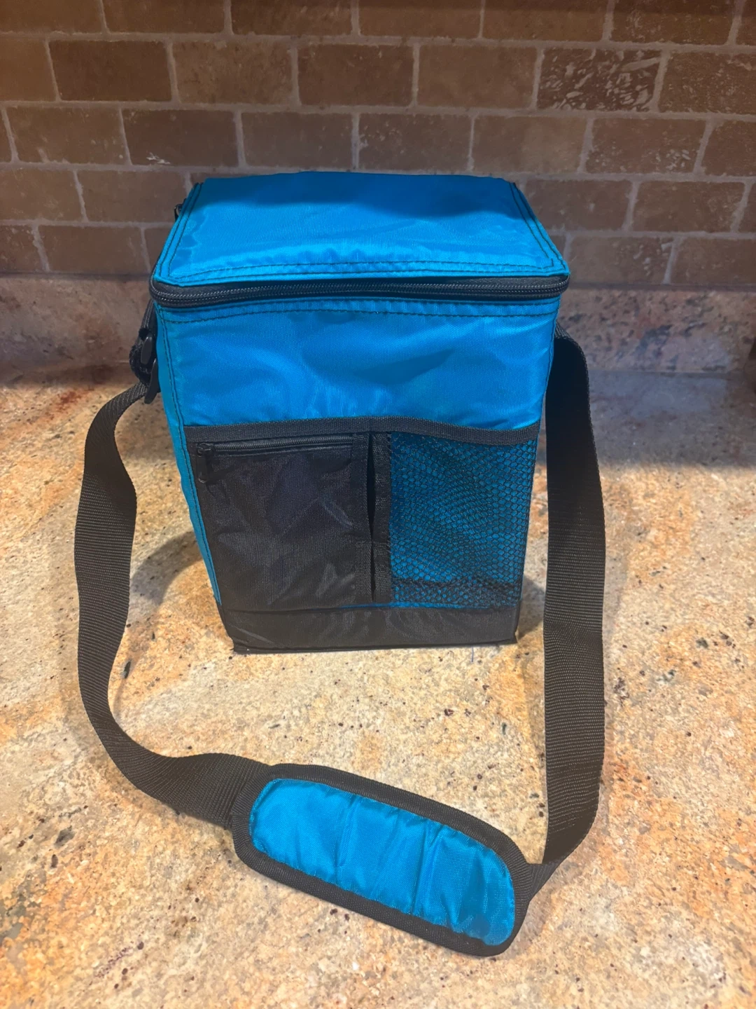Here's a handy blue insulated lunch bag! It's great for keeping your food and drinks cool on the go. It features a convenient shoulder strap and some handy pockets on the front and side!