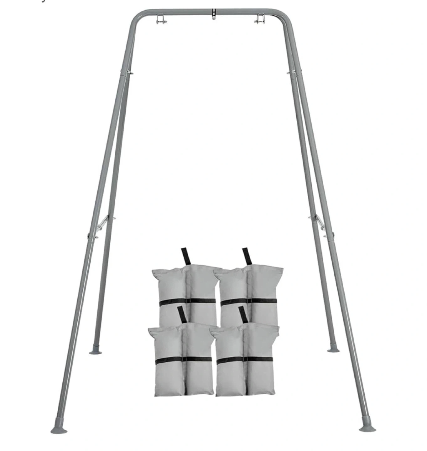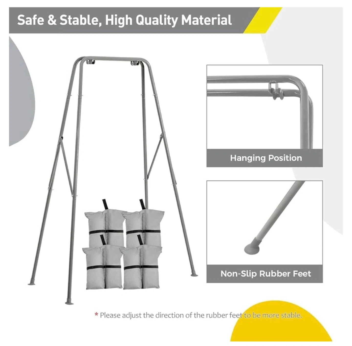 This foldable swing stand is designed for easy setup and storage, so you can have fun anywhere! It includes four sandbags for added stability. The stand measures 61 inches tall and has a bearing weight of 200lb/90kg. It features non-slip rubber feet for extra safety. This stand is useful for outdoor play, providing a secure base for swings or jumpers.