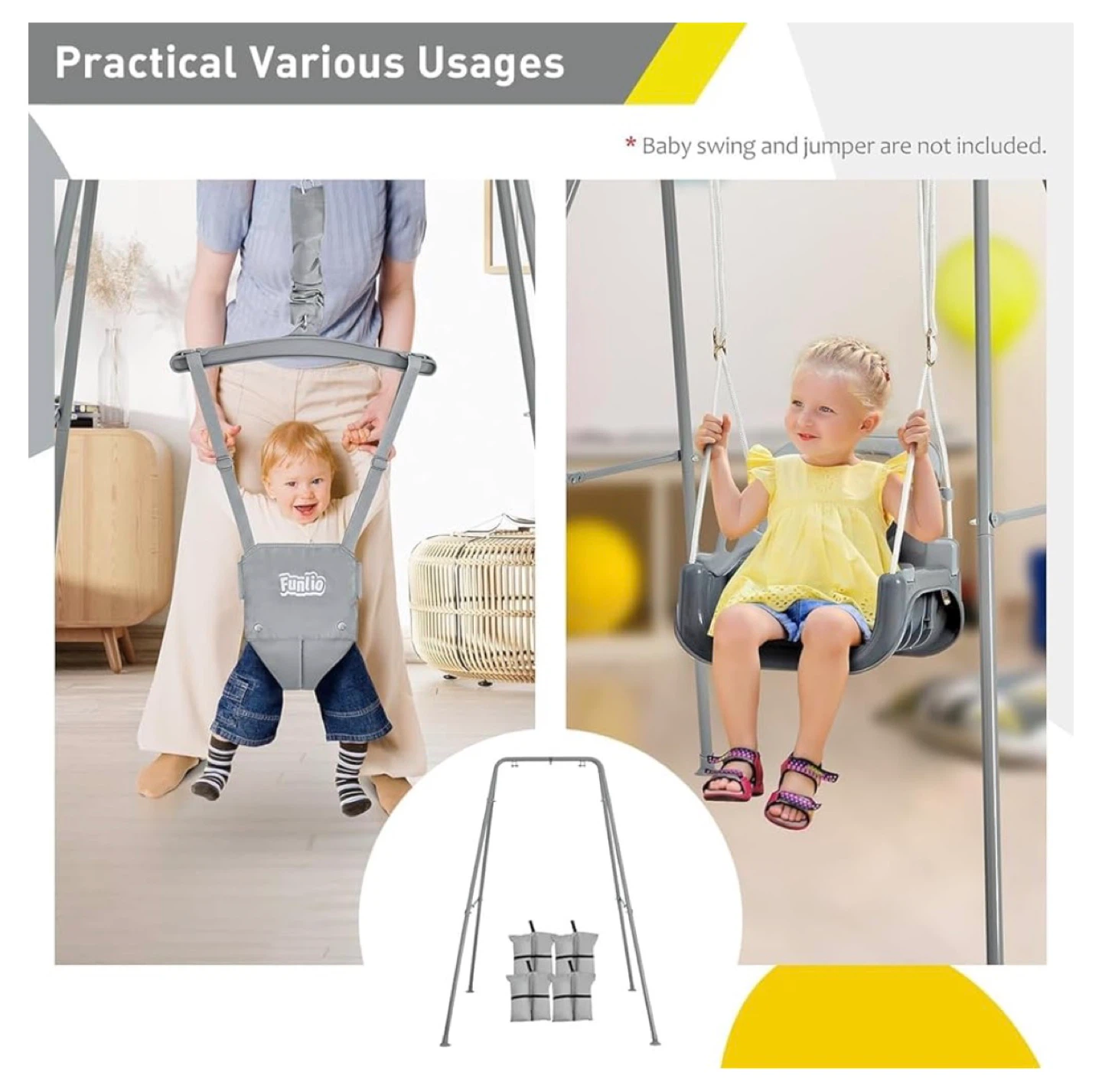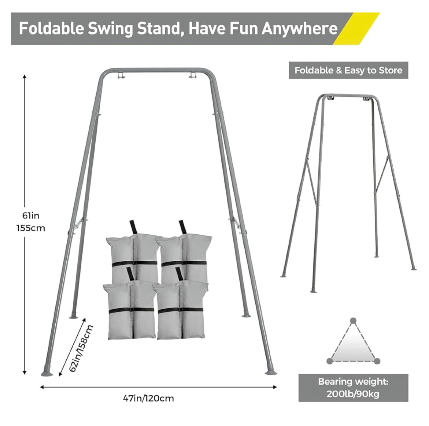 This foldable swing stand is designed for easy setup and storage, so you can have fun anywhere! It includes four sandbags for added stability. The stand measures 61 inches tall and has a bearing weight of 200lb/90kg. It features non-slip rubber feet for extra safety. This stand is useful for outdoor play, providing a secure base for swings or jumpers.