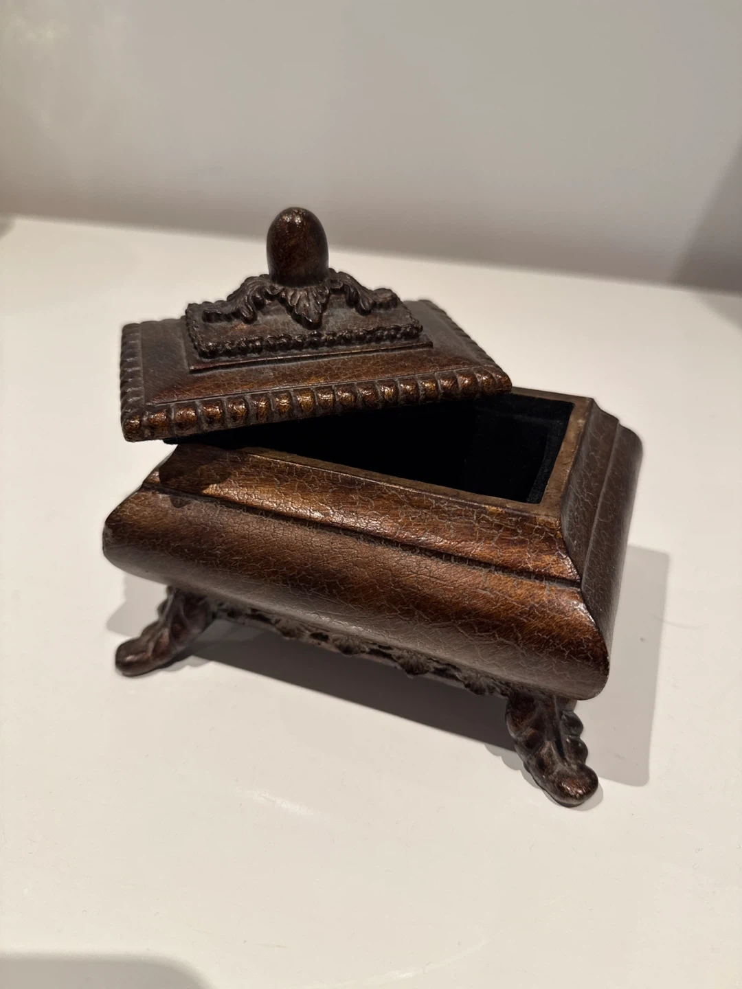 This ornate trinket box is perfect for storing small treasures. It features a detailed, antique-style design with a hinged lid. The interior is lined with soft black fabric.