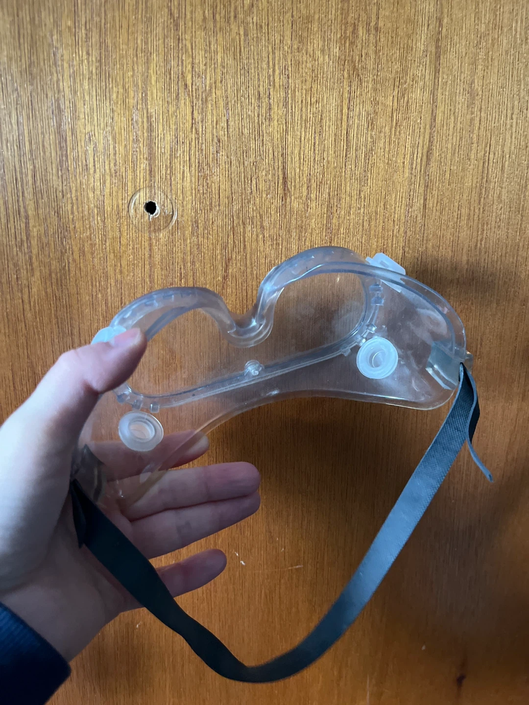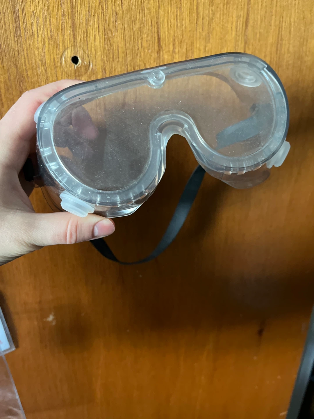 Used for 1 Semester for a chemistry class. These are clear safety goggles with a strap. They're made of plastic and offer eye protection. Useful for various tasks requiring eye safety.