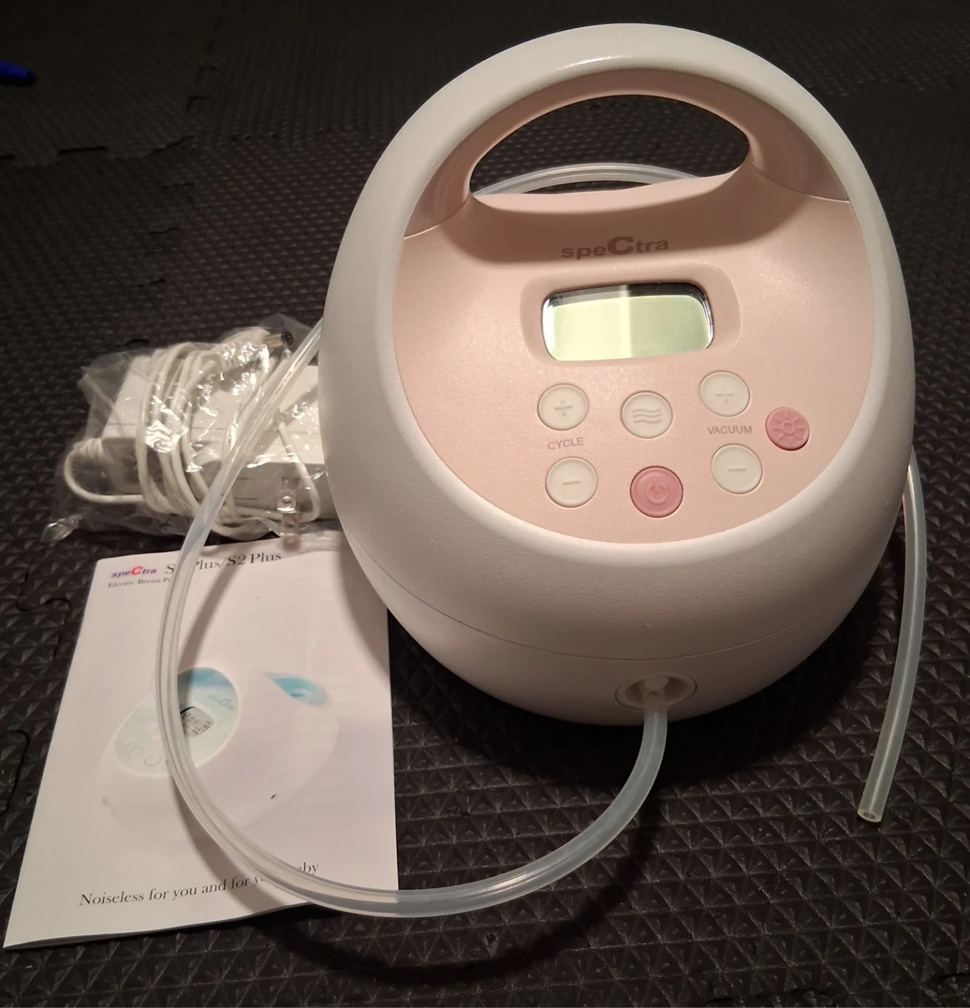This Spectra S1 Plus electric breast pump is white and pink. It includes the pump, power adapter, and an instruction manual. It's designed to be quiet for discreet use.