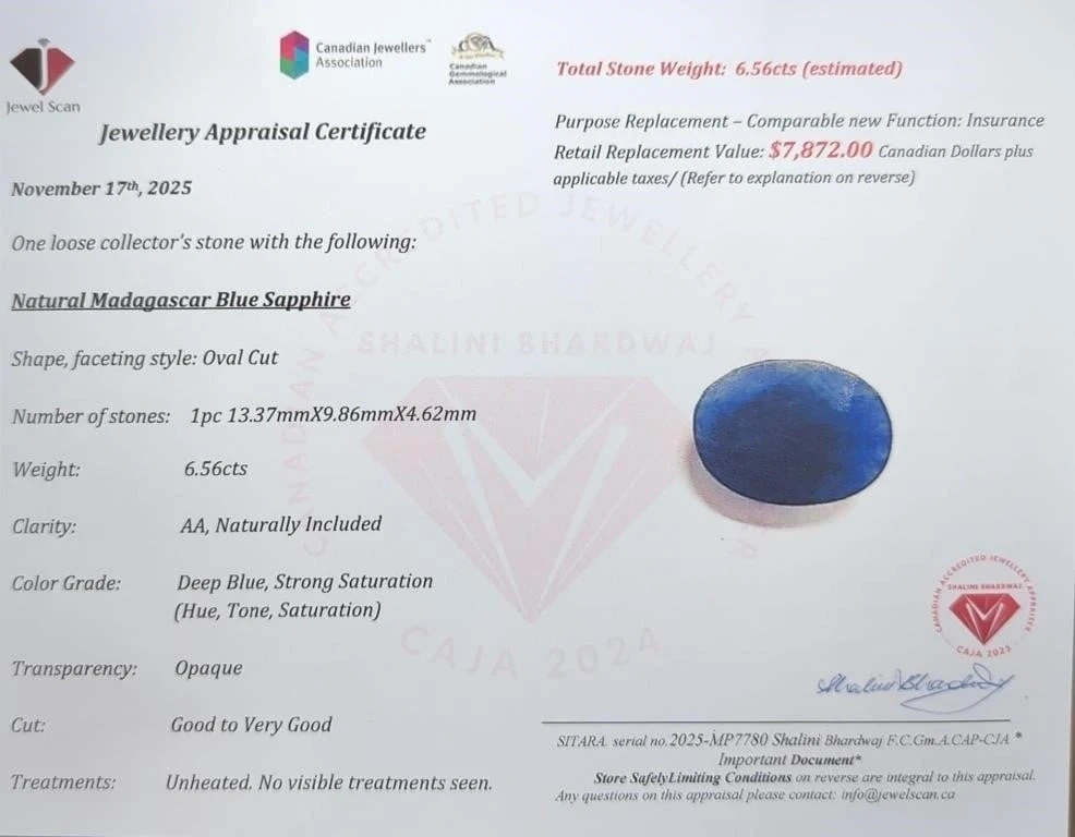 6.56 Carat oval cut natural madagascar blue sapphire, appraised at retail value of $7872.00 (See second picture).