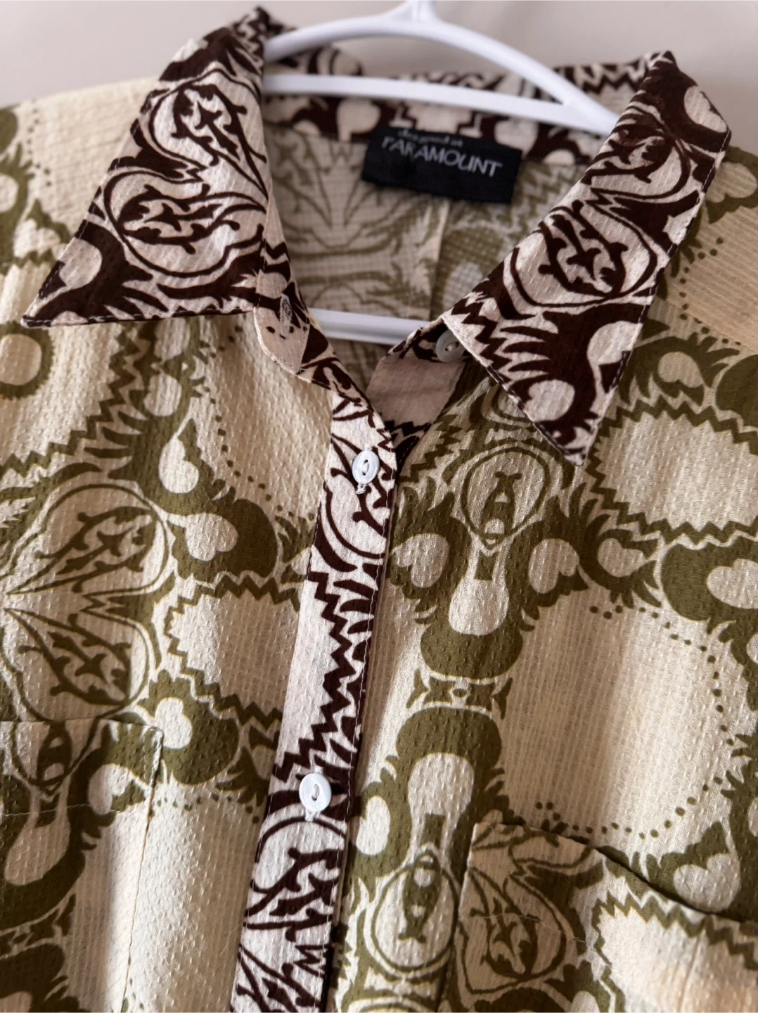 Here's a button-up shirt from Paramount! It features a unique pattern in shades of brown and beige. Perfect for adding a bit of flair to your wardrobe!