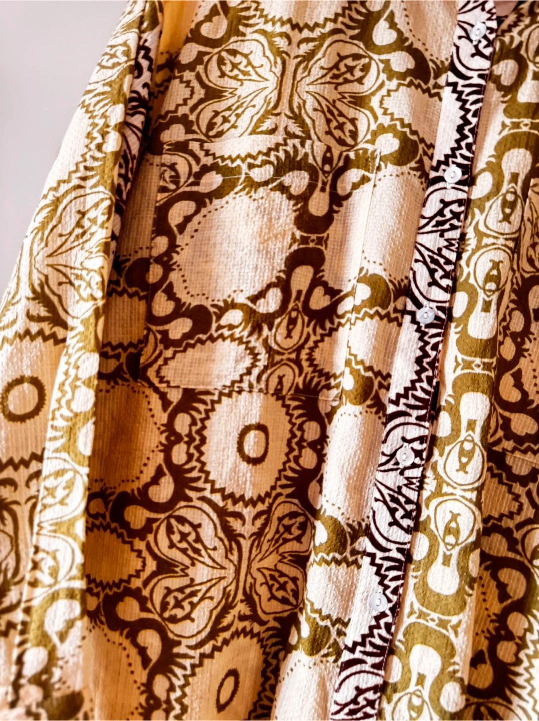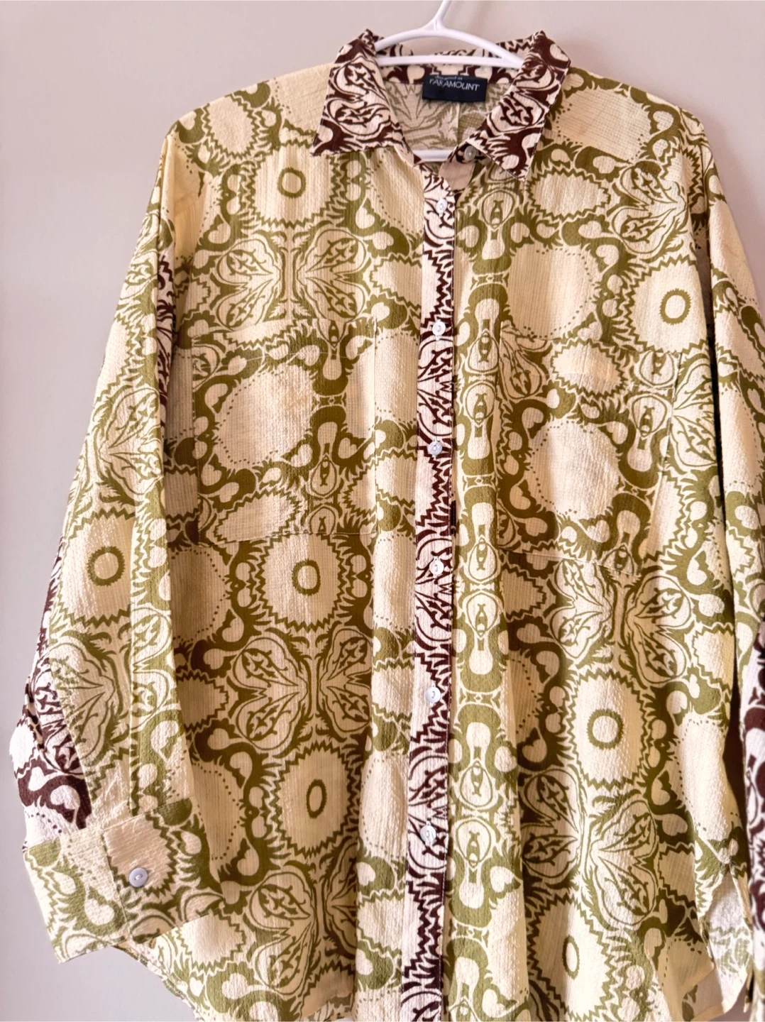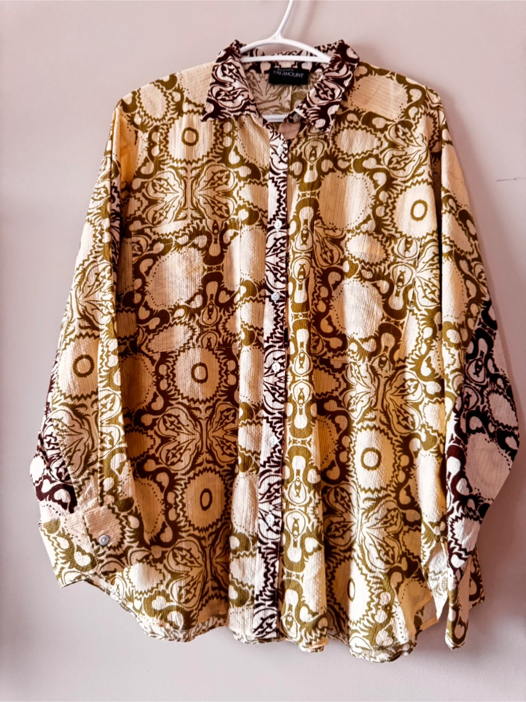 Here's a button-up shirt from Paramount! It features a unique pattern in shades of brown and beige. Perfect for adding a bit of flair to your wardrobe!