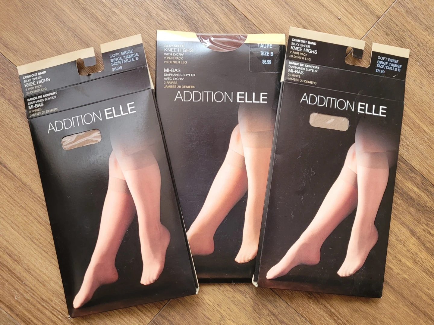 You're getting three packs of Addition Elle Silky Sheer Knee Highs, all in size B. Two packs are in Soft Beige, and one is in Taupe. They're 20 denier and made with Lycra. Comfort band design.