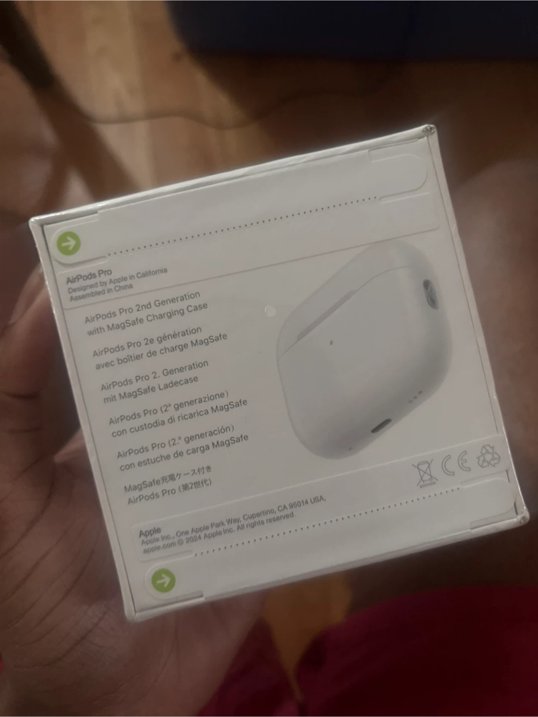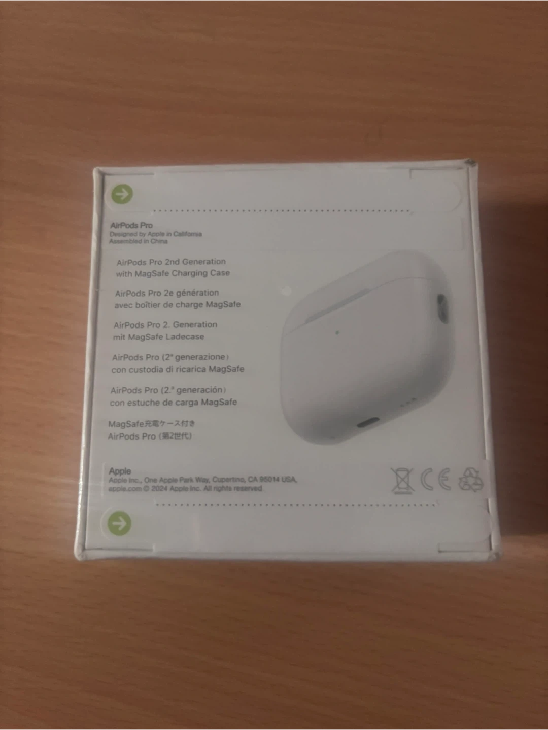 Apple AirPods Pro (2nd generation) with MagSafe charging case. Designed by Apple in California and assembled in China. It's the latest model with enhanced charging capabilities.