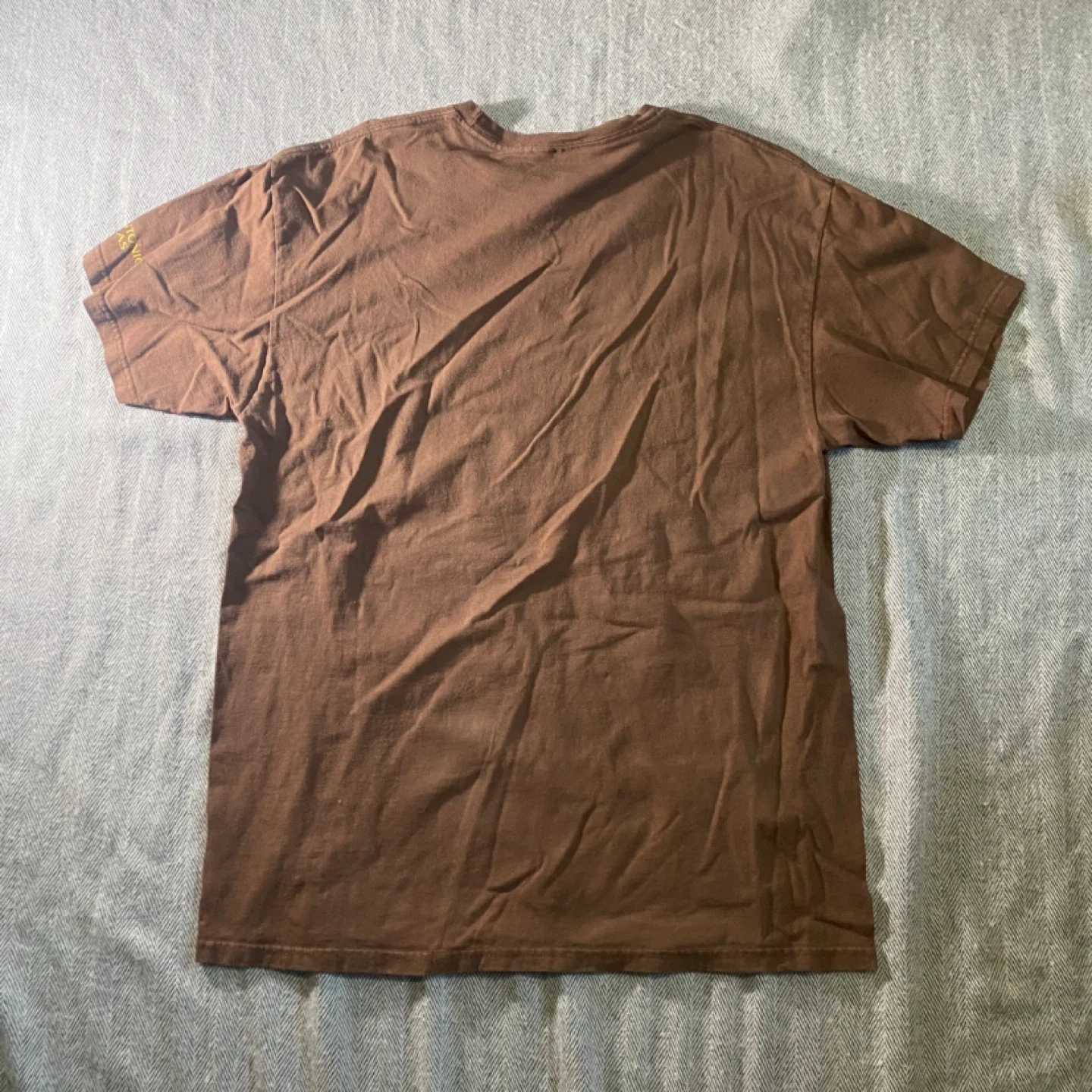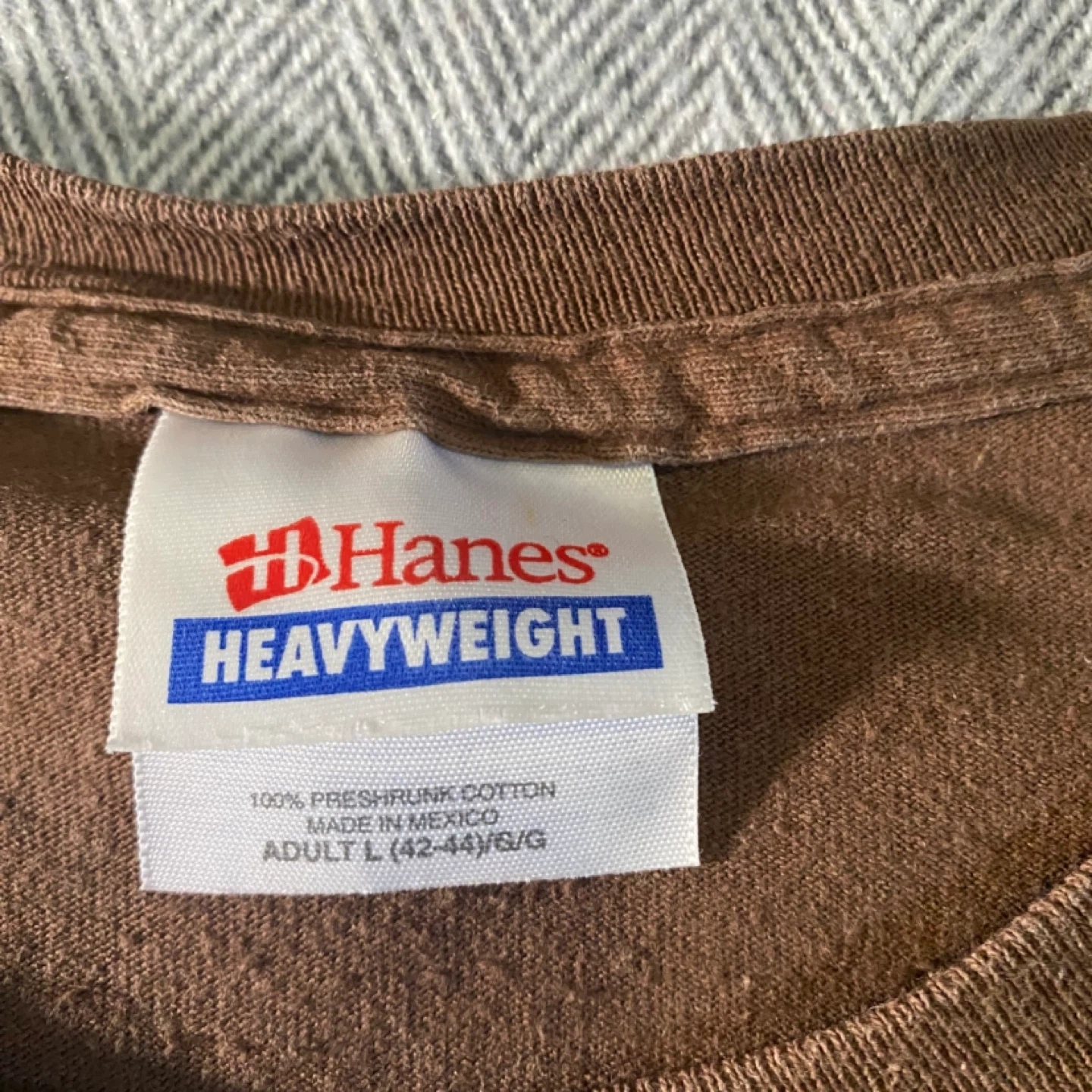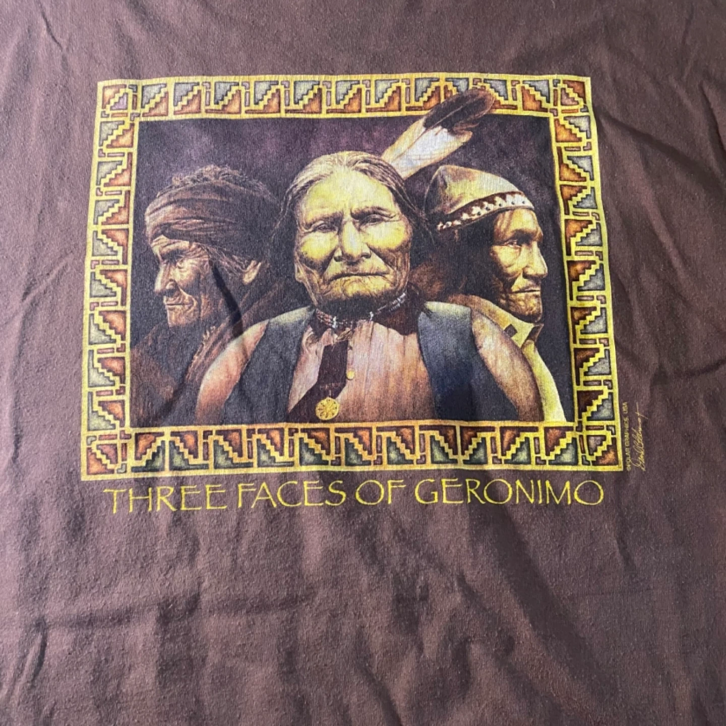 Brown Hanes Heavyweight t-shirt with a "Three Faces of Geronimo" graphic on the front. It's 100% preshrunk cotton and made in Mexico. Adult size large (42-44).