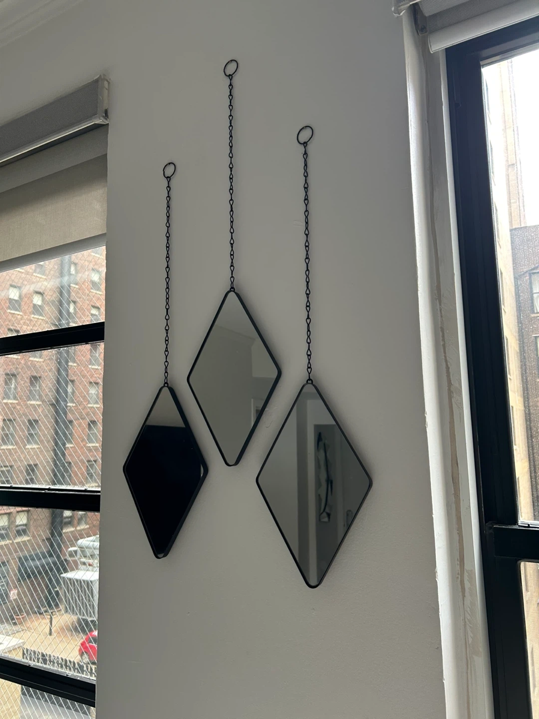 This set includes three diamond-shaped mirrors, each with a black metal frame and hanging chain. They're perfect for adding a touch of modern style to any room! The mirrors have a dark metal finish.