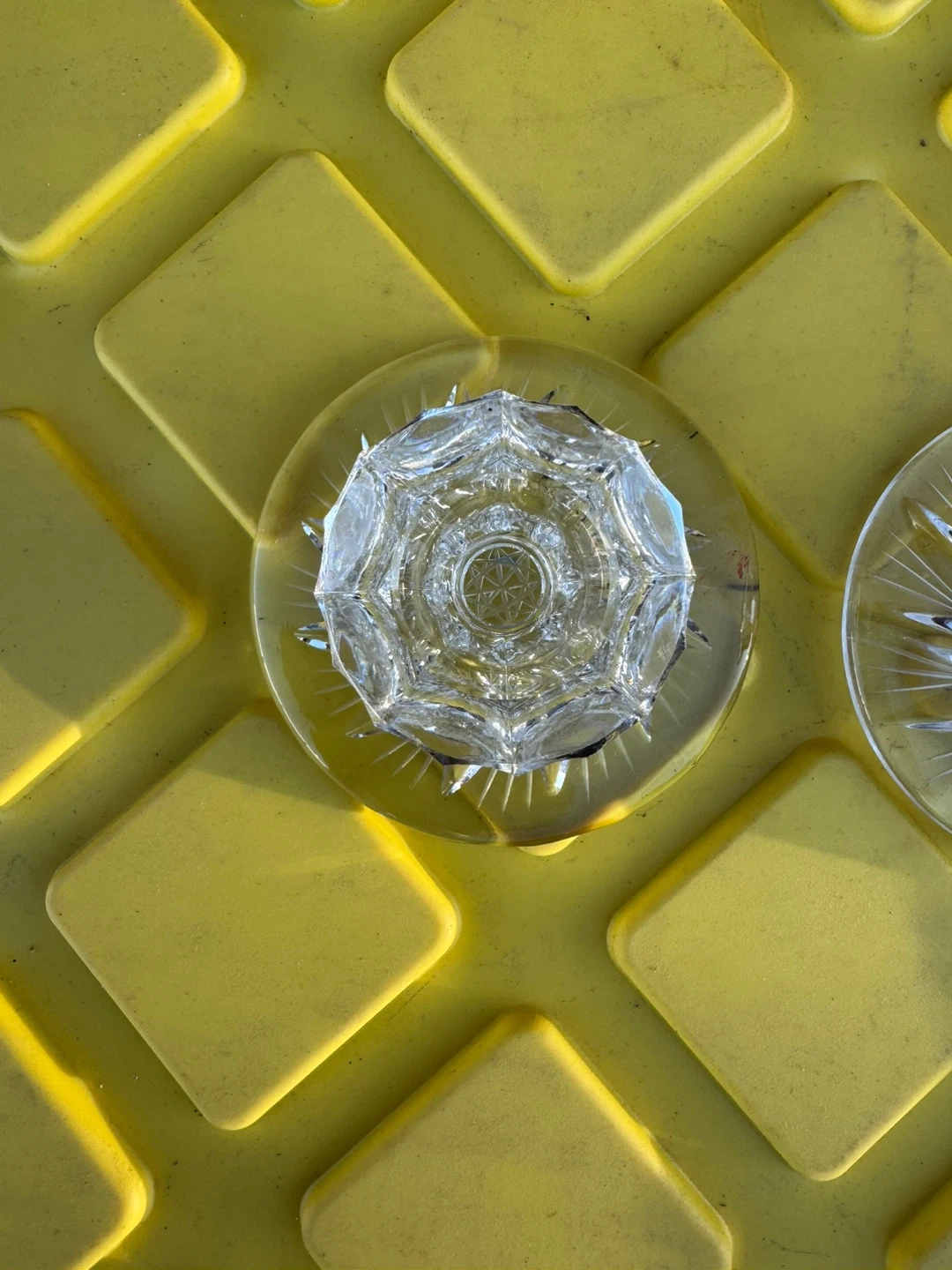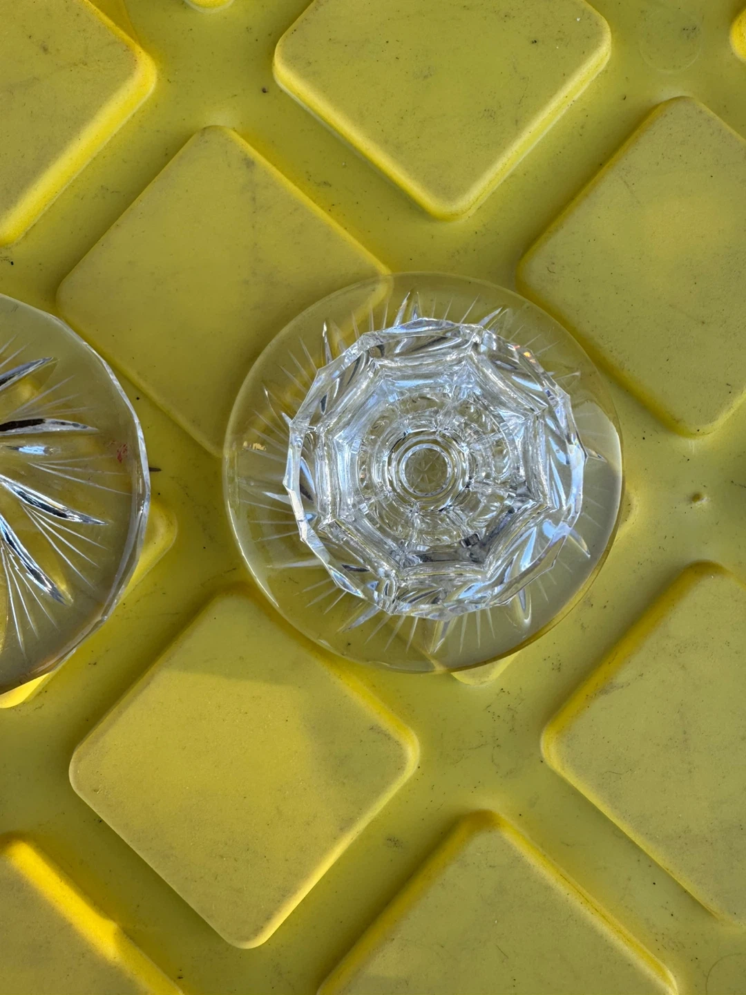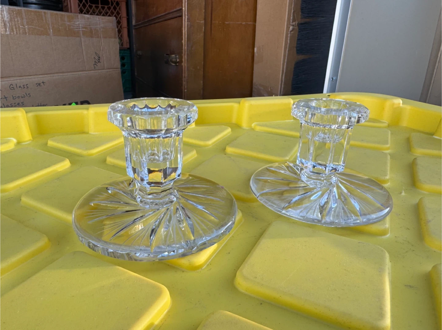 These are two clear pinwheel crystal candlestick holders. They feature intricate cut glass designs on the base and stem. Perfect for adding a touch of elegance to any table setting! $20 for the pair. Located in Penticton