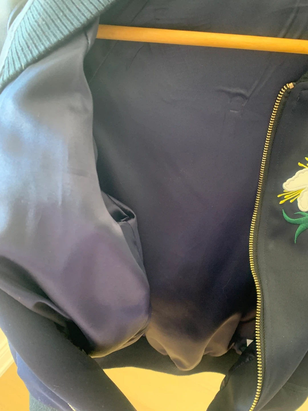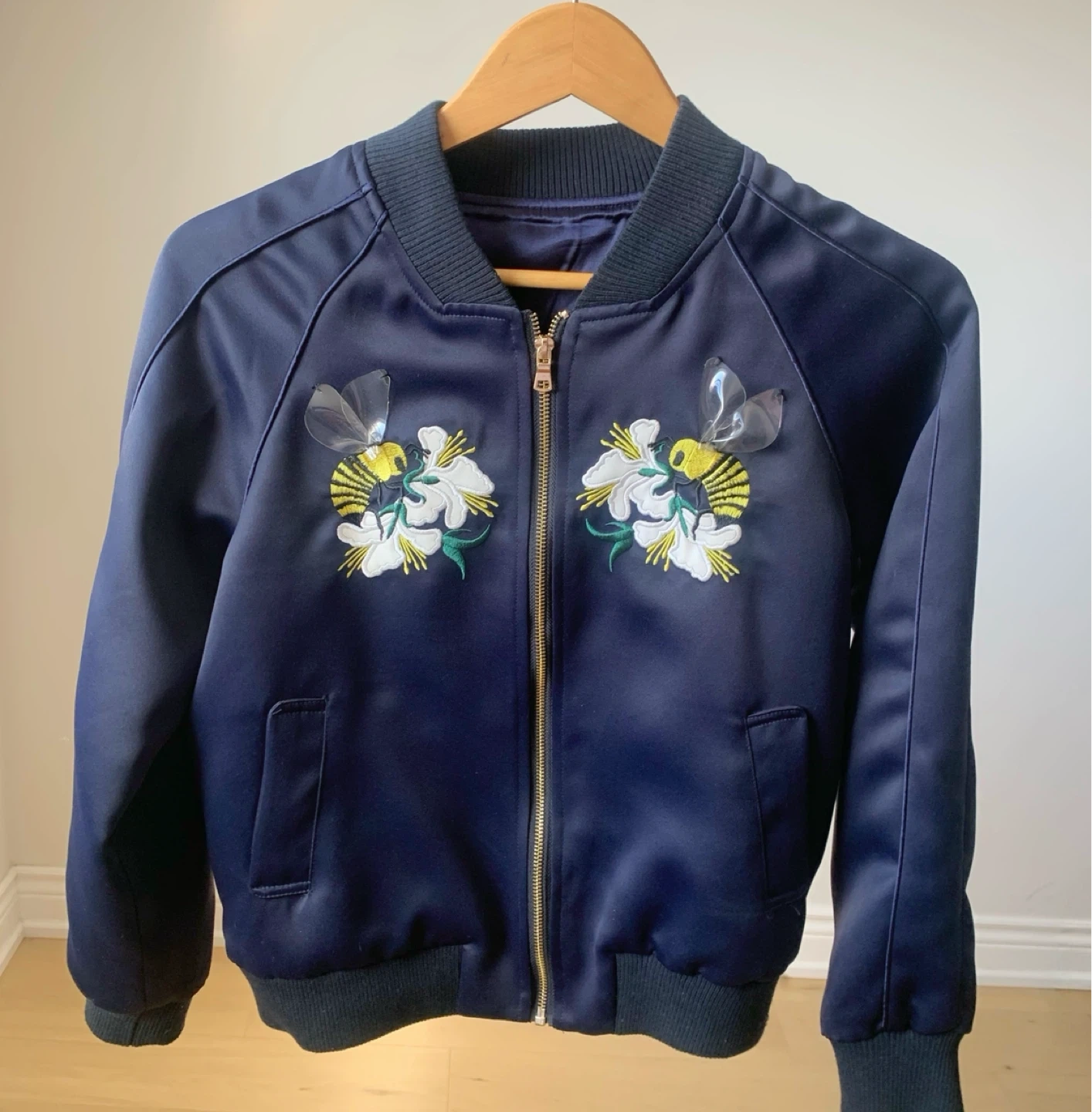 Navy Satin Bomber Jacket with Bee Embroidery – Size M