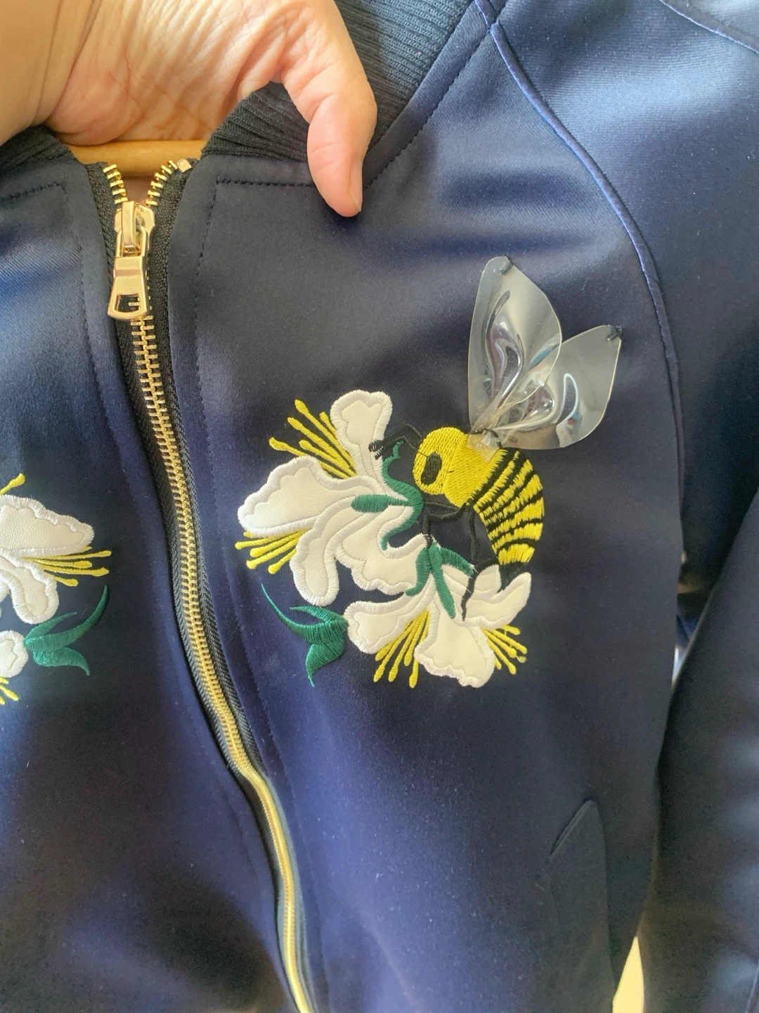 Features two beautifully embroidered bees on the front, with transparent plastic wings that add a unique and delicate detail.