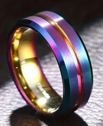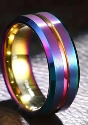 Cool rainbow coloured titanium ring with a polished centre groove. It's very shiny and has a brushed finish on the sides. Comfortable fit, suitable for daily wear. This ring makes a statement piece!