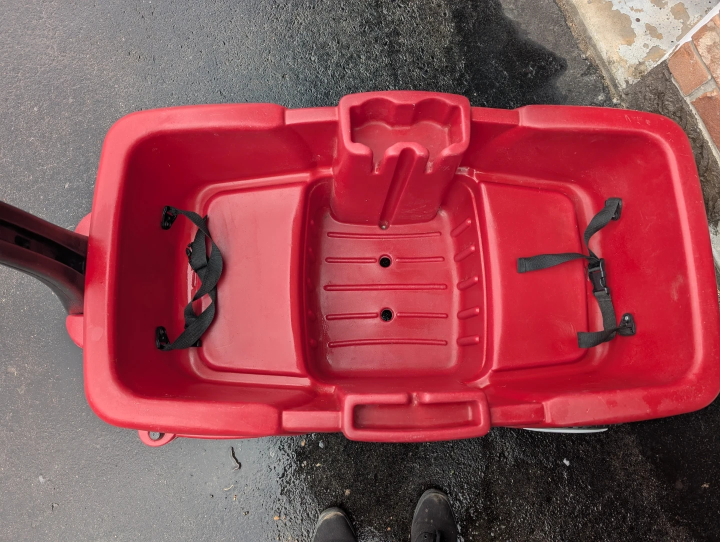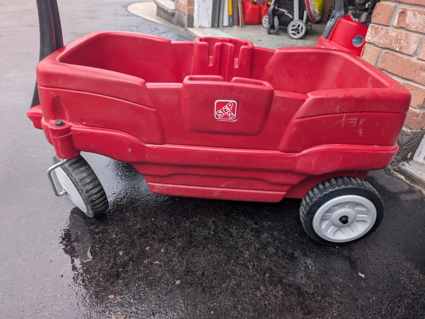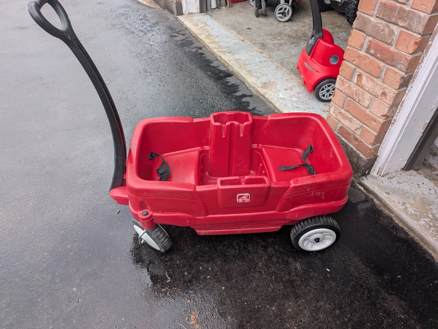 This red Step2 wagon is great for hauling toys and gear. It's made of durable plastic and features two seat belts for safety. It's perfect for kids to use on outdoor adventures!
