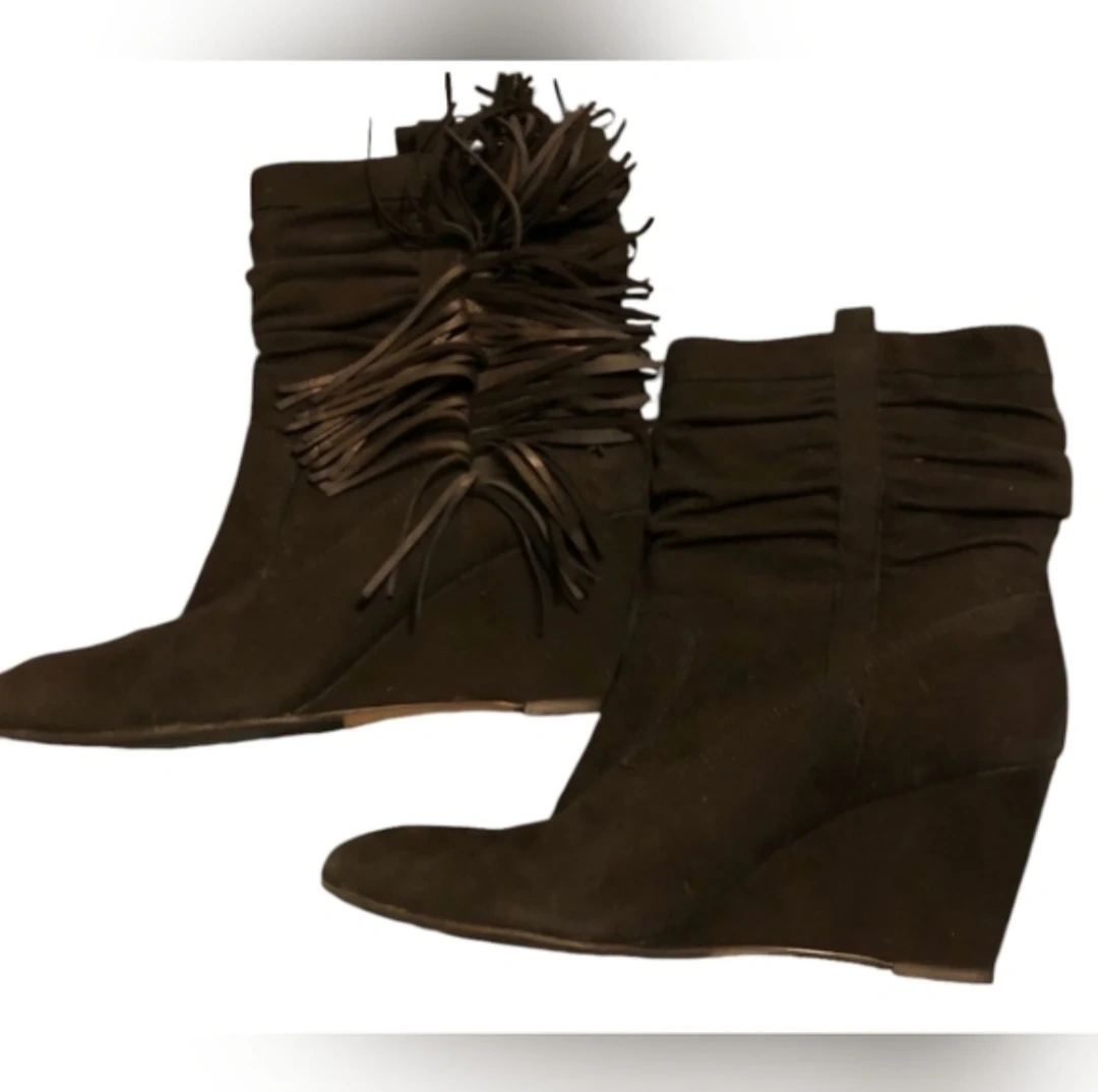 These suede wedge heels are in excellent condition and feature a stylish fringe design. The heels are approximately 4 inches high and provide a comfortable and elegant look.