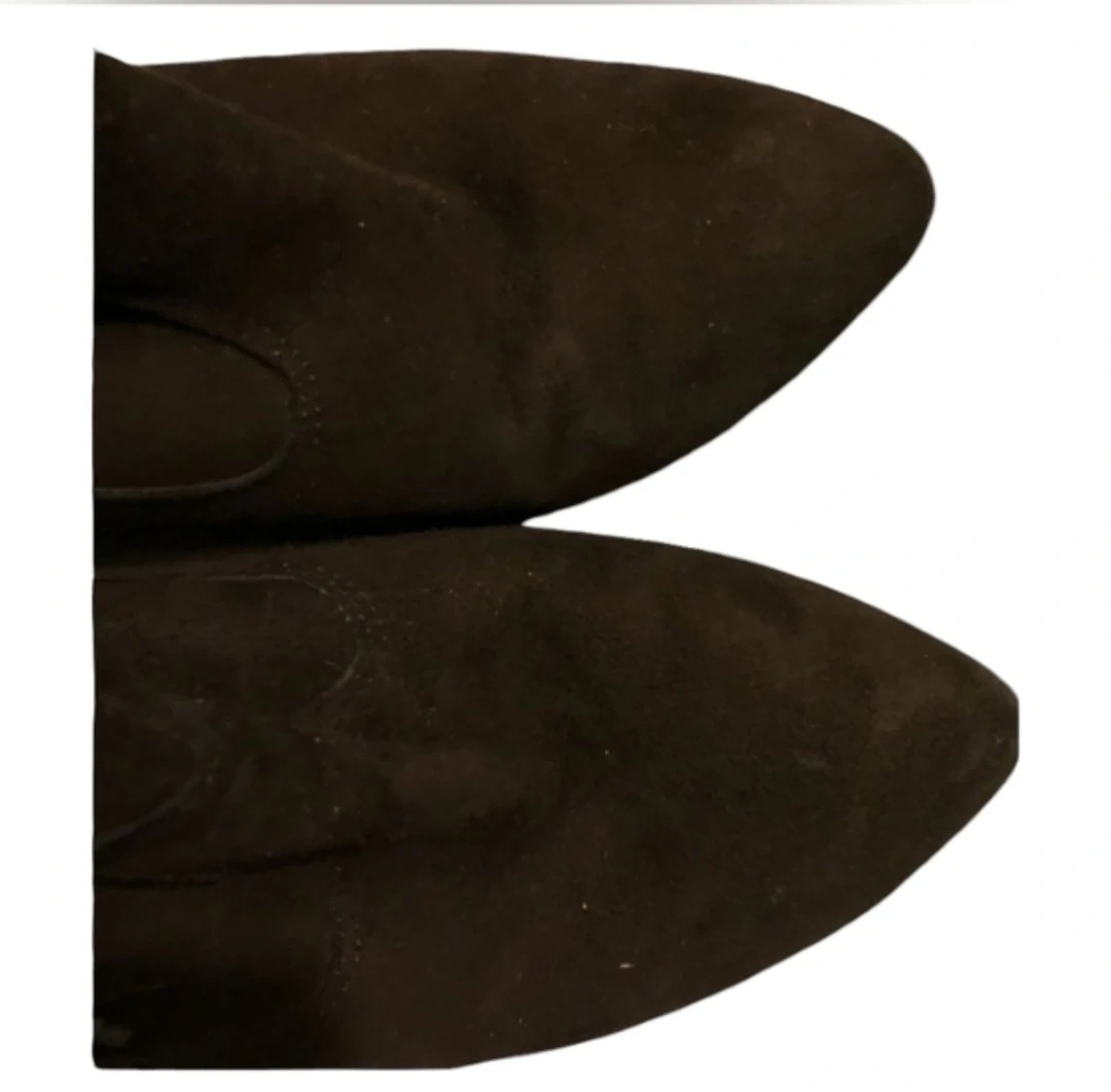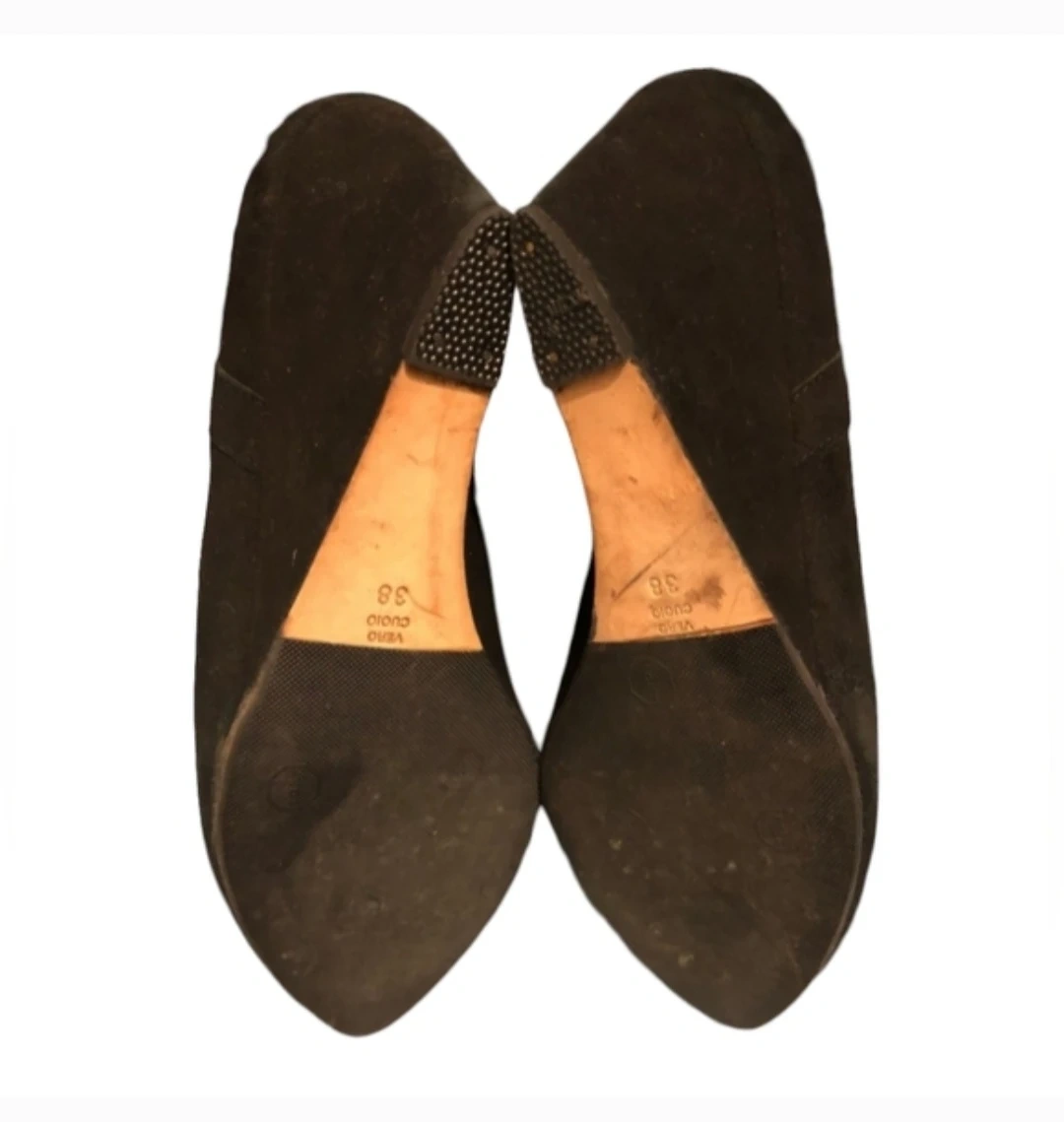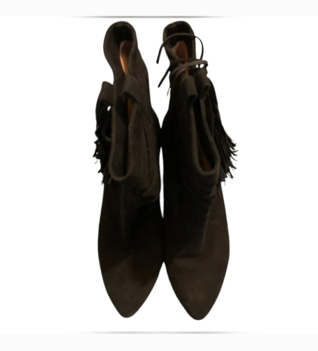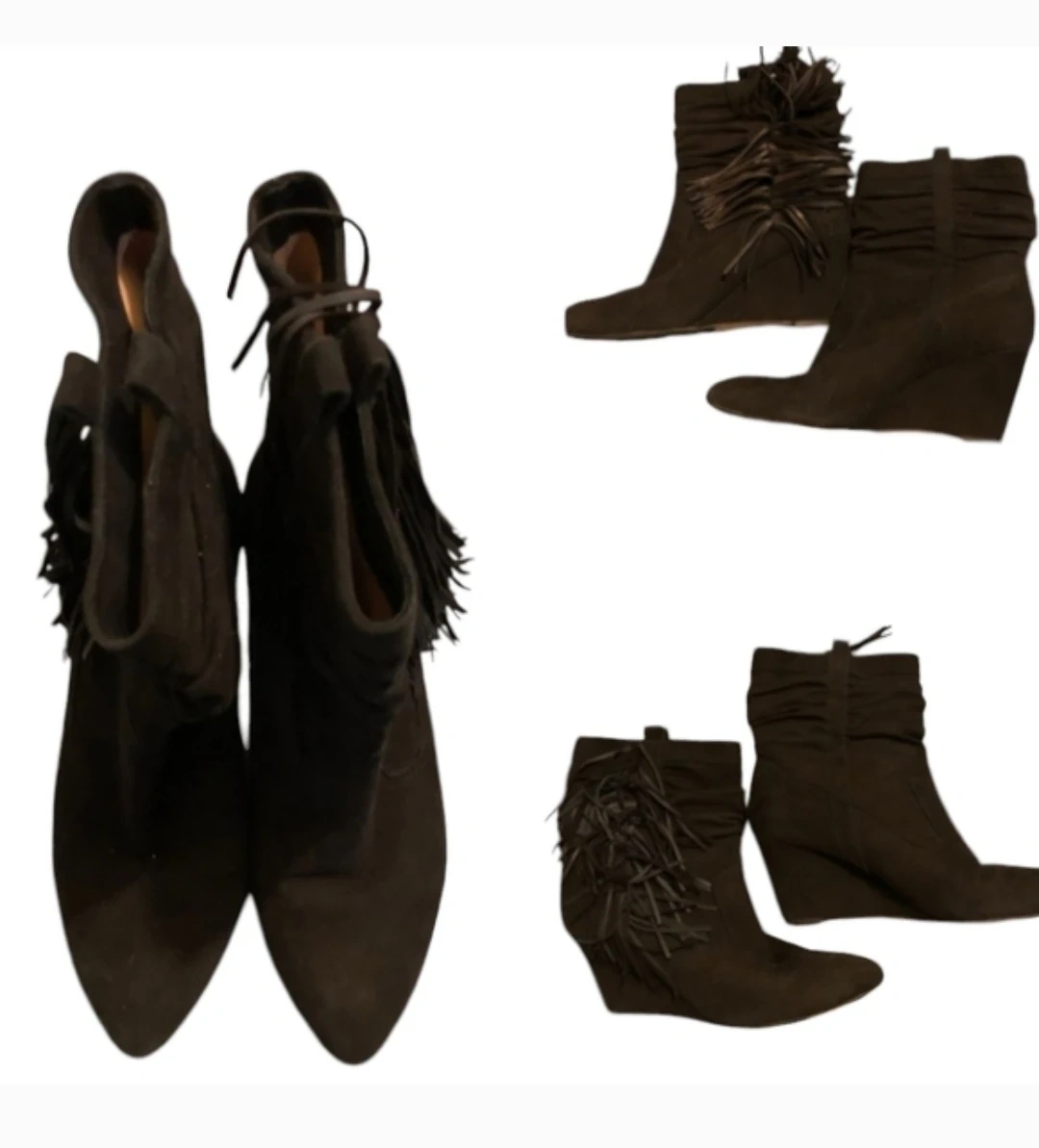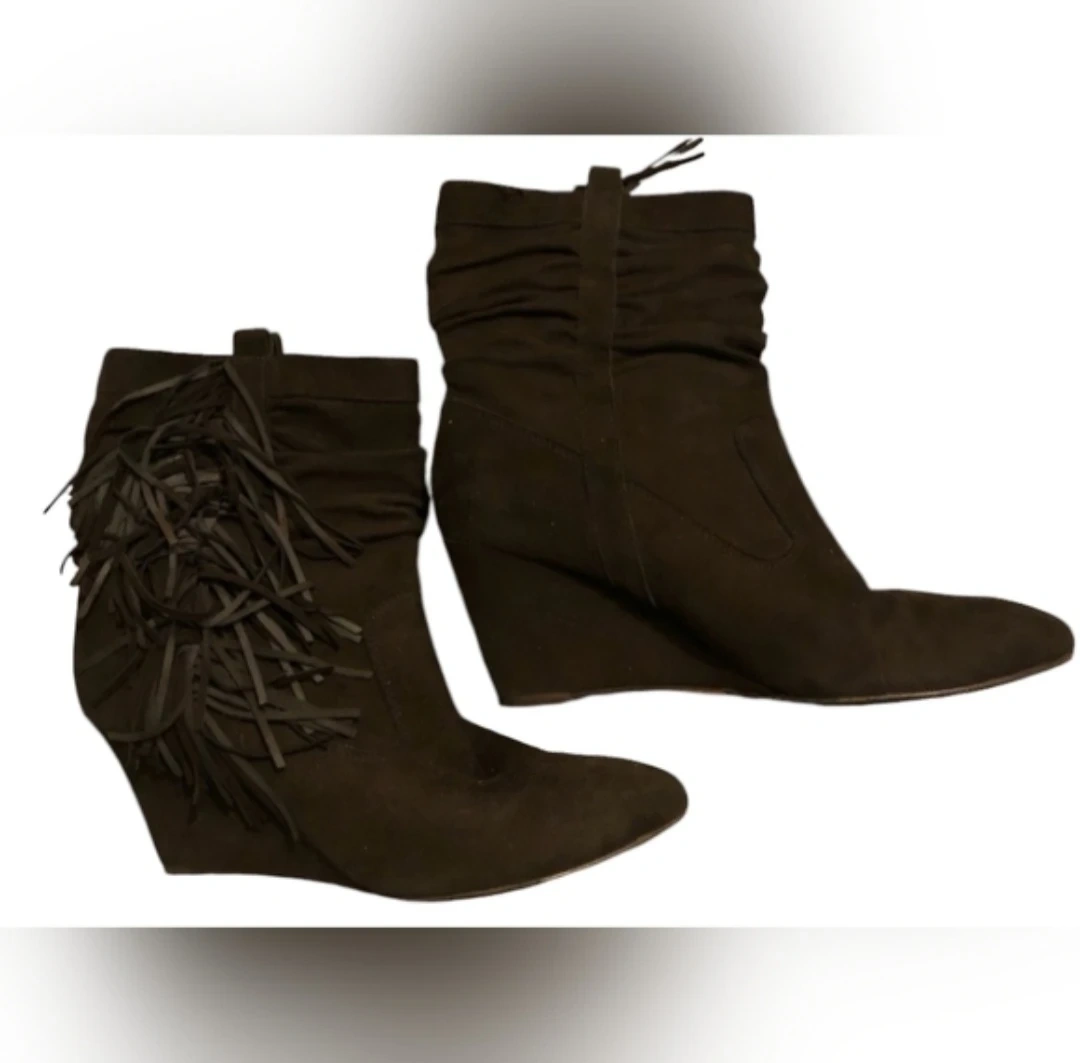 These suede wedge heels are in excellent condition and feature a stylish fringe design. The heels are approximately 4 inches high and provide a comfortable and elegant look.