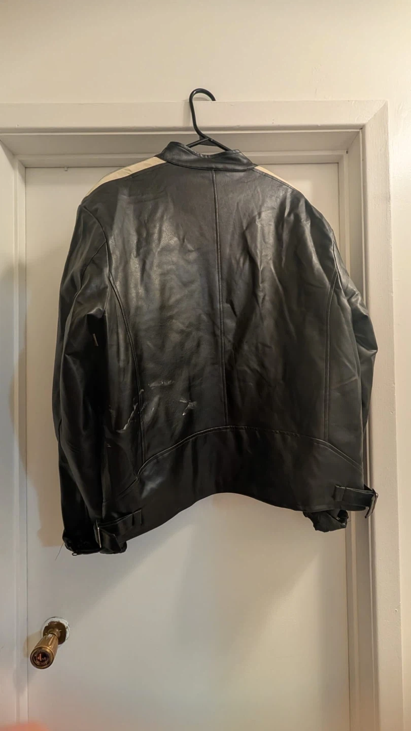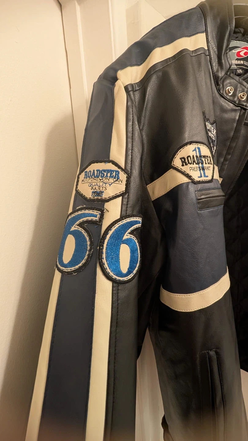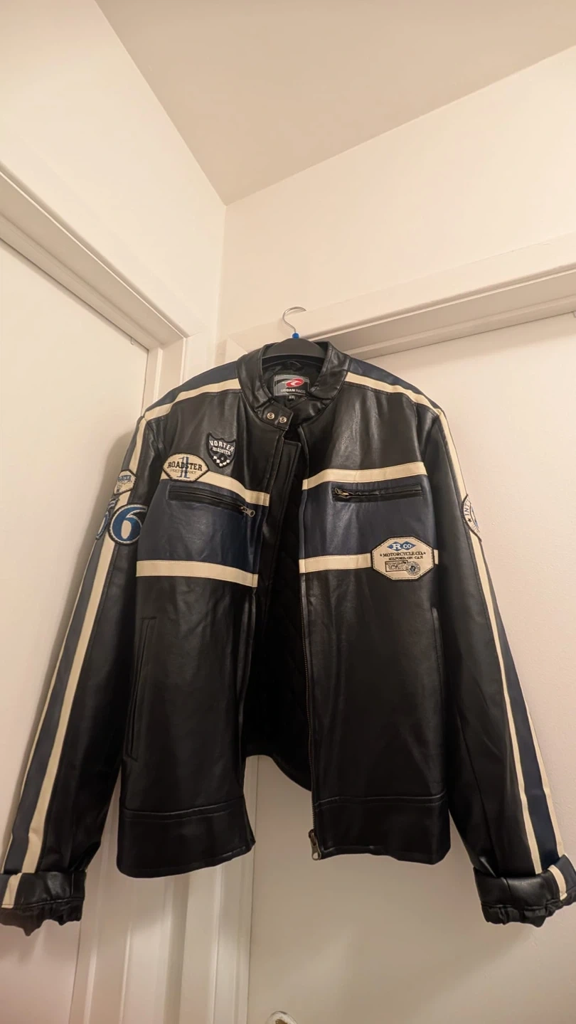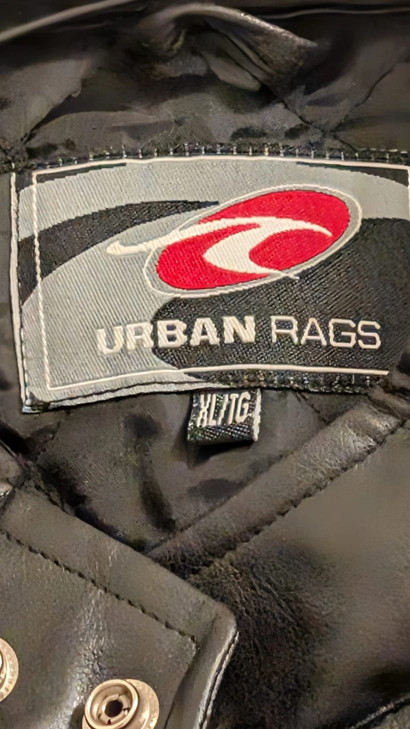 Selling a stylish black leather jacket from Urban Rags. It's a size XL/TG. The jacket has a cool design with stripes and patches, giving it a unique look!