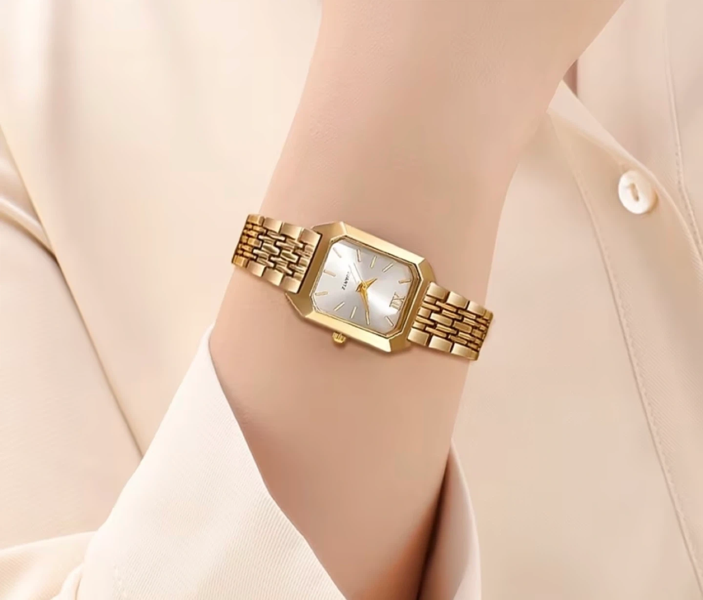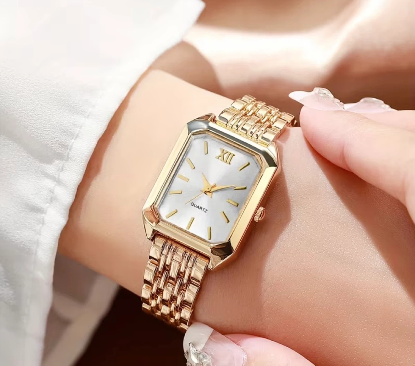 This gold-tone watch features a rectangular face with Roman numerals at the 12 o'clock position. It has a classic quartz movement and a stylish linked bracelet. It's a beautiful accessory for any occasion!