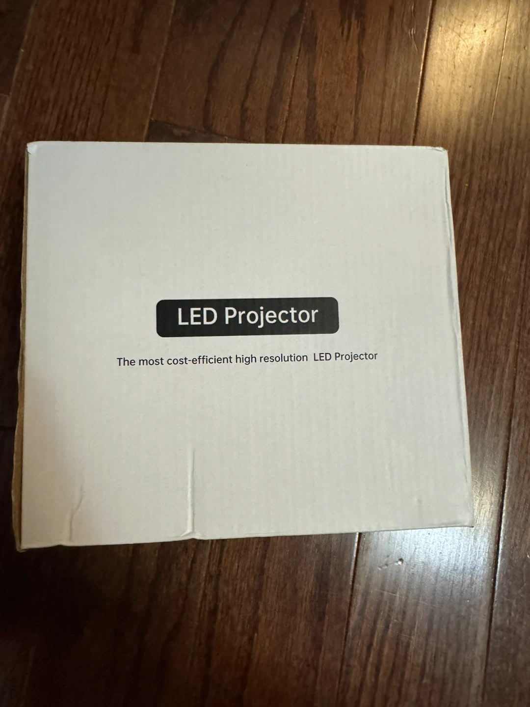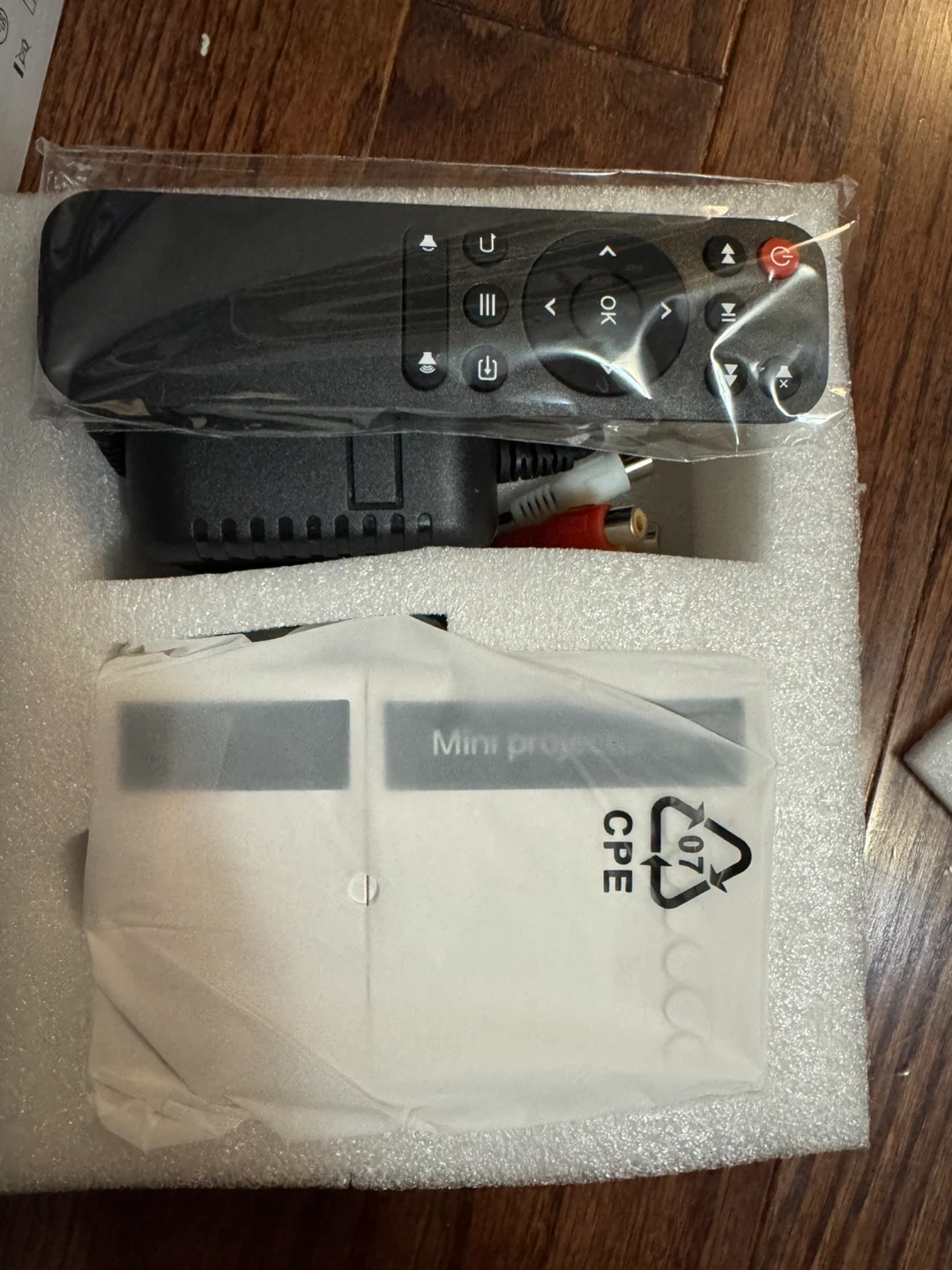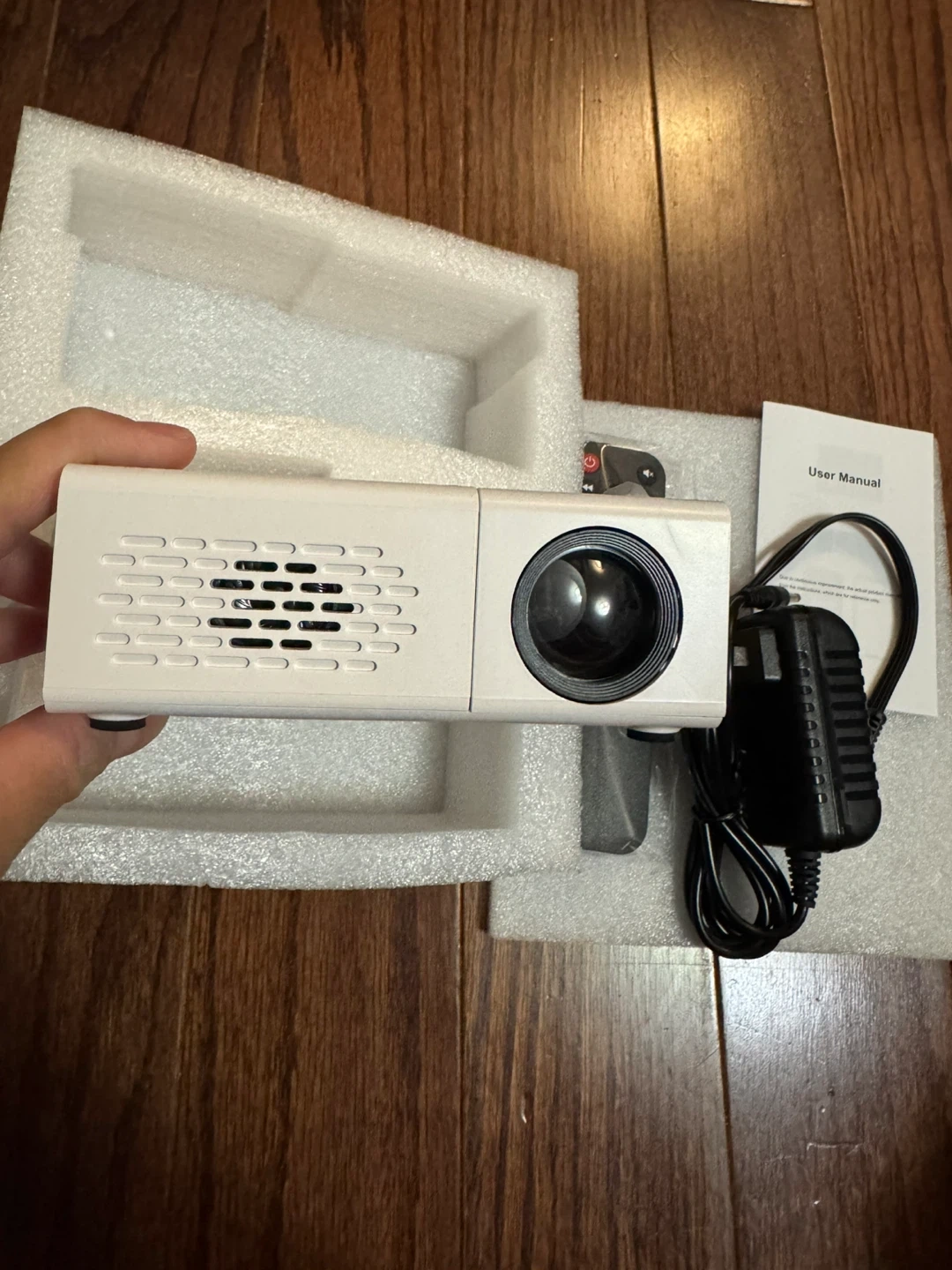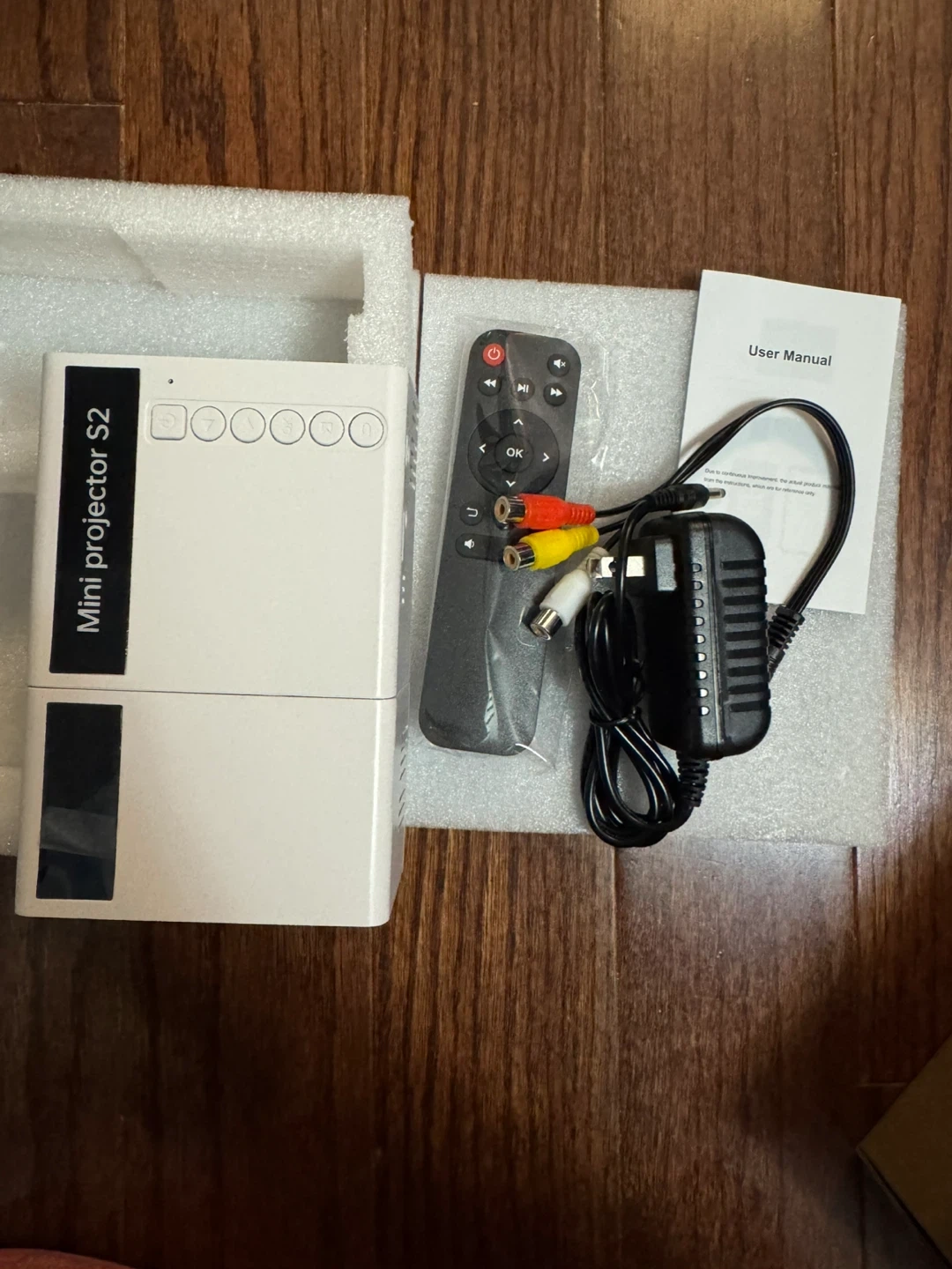 This is a mini LED projector, model S2. It comes with a remote, user manual, and power adapter. It's designed for cost-efficient high resolution projection.