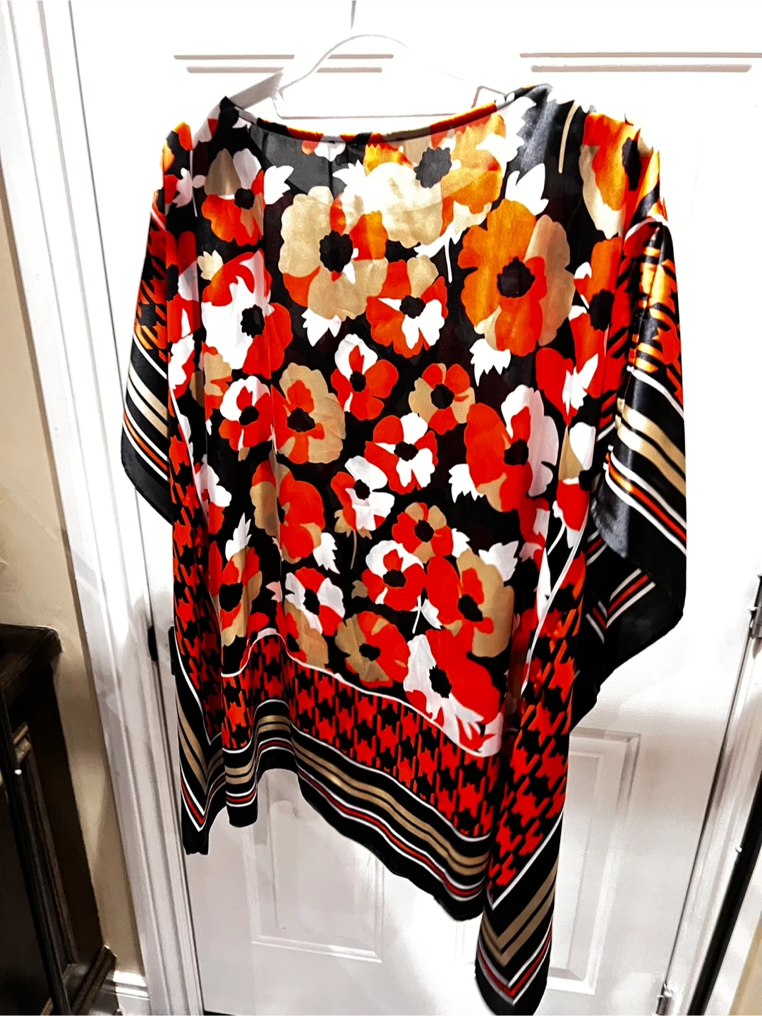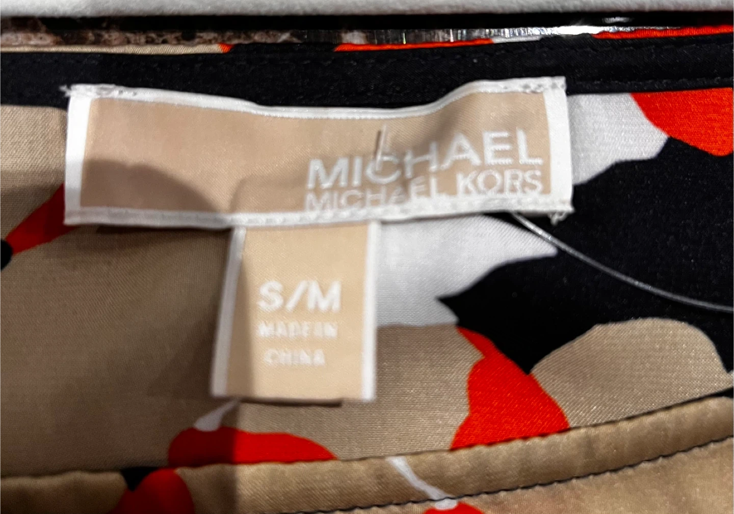 Here's a beautiful floral print top from Michael Michael Kors! It's a size S and features a vibrant floral design in red, white, gold, and black. This top is perfect for adding a pop of colour to your wardrobe