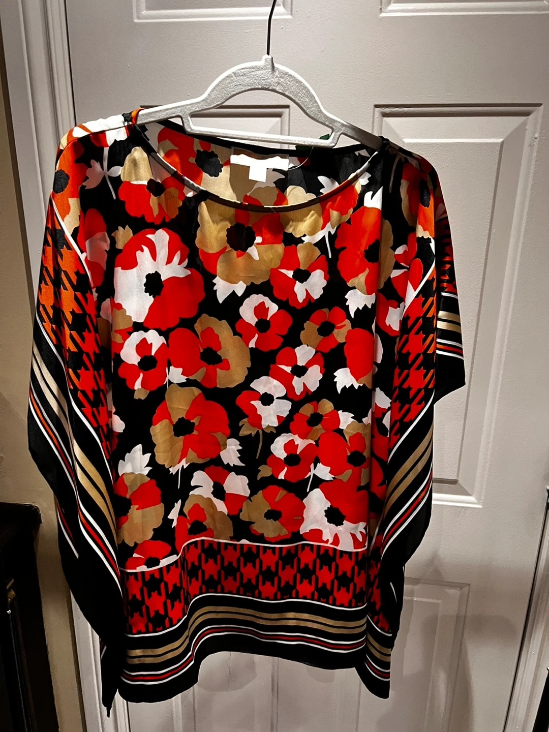 Here's a beautiful floral print top from Michael Michael Kors! It's a size S and features a vibrant floral design in red, white, gold, and black. This top is perfect for adding a pop of colour to your wardrobe