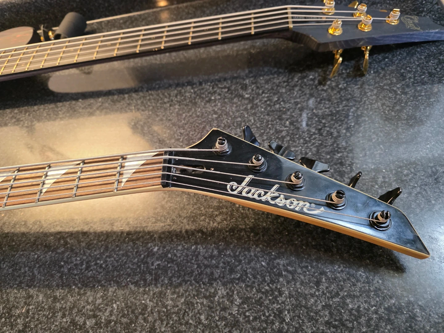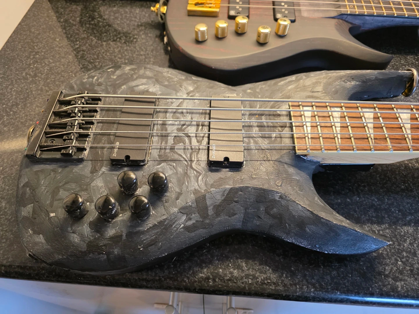 Jackson JS 5 string bass. The body was modified (carved and painted). Good instrument to transition from 4 to 5 strings. EMG HZ pick-ups. Neck and body are maple, fretboard is rosewood. Haven't use it in 4 years. Strings are pretty old.