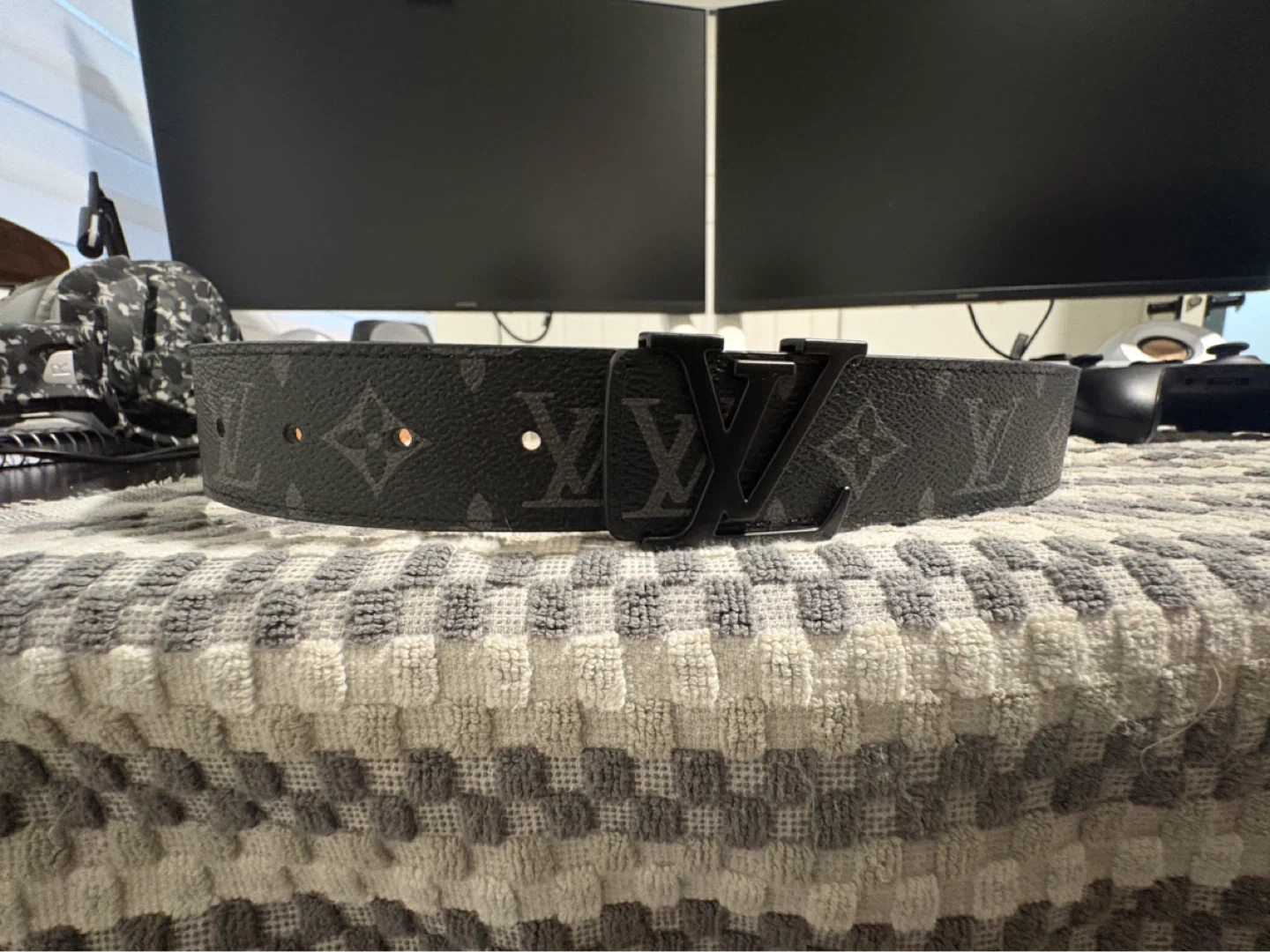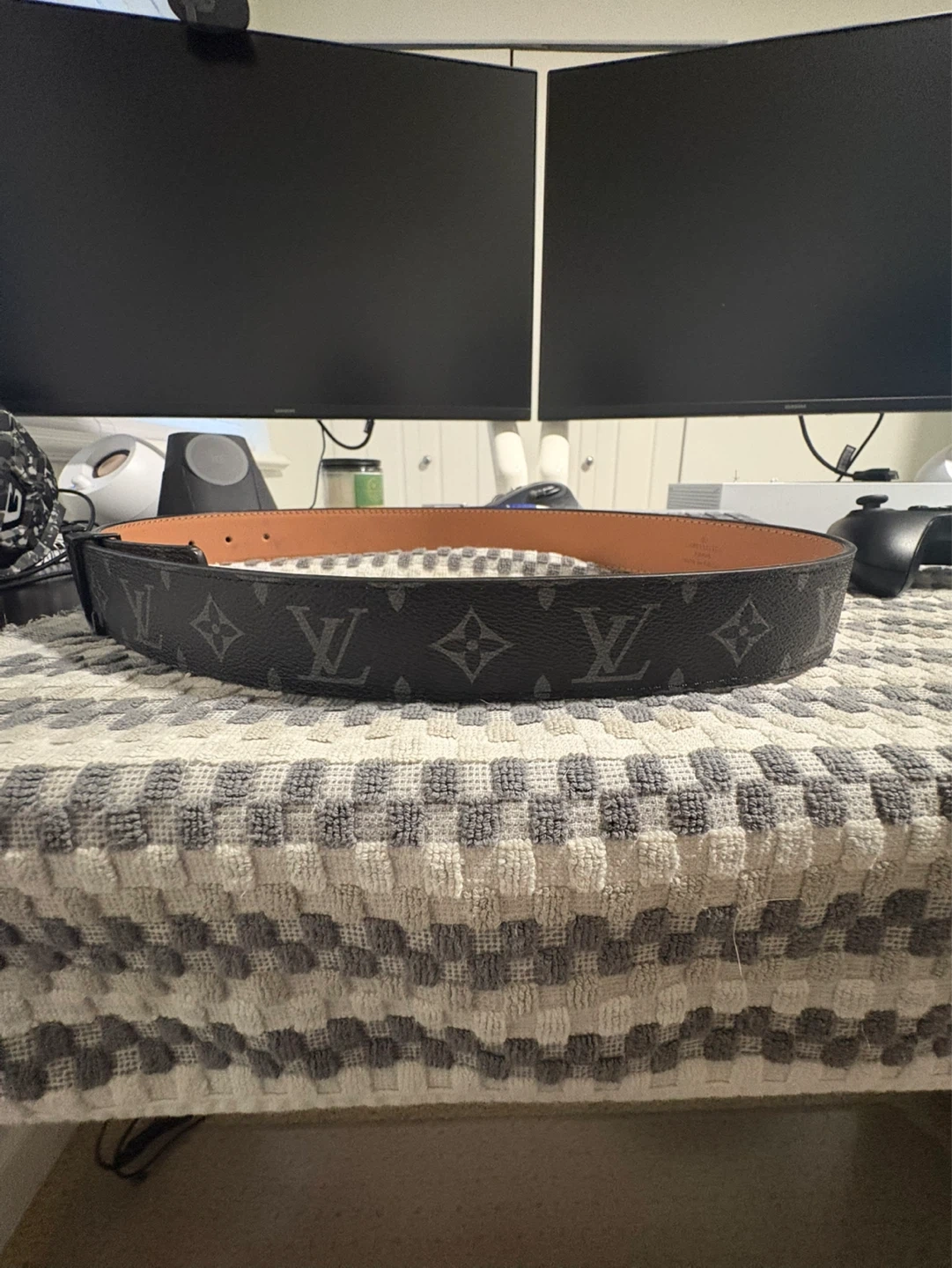 Louis Vuitton belt in black with signature monogram print. Made in France. Features a black LV buckle. The interior is tan leather with some minor marks.this product is a R3P, price is negotiable!