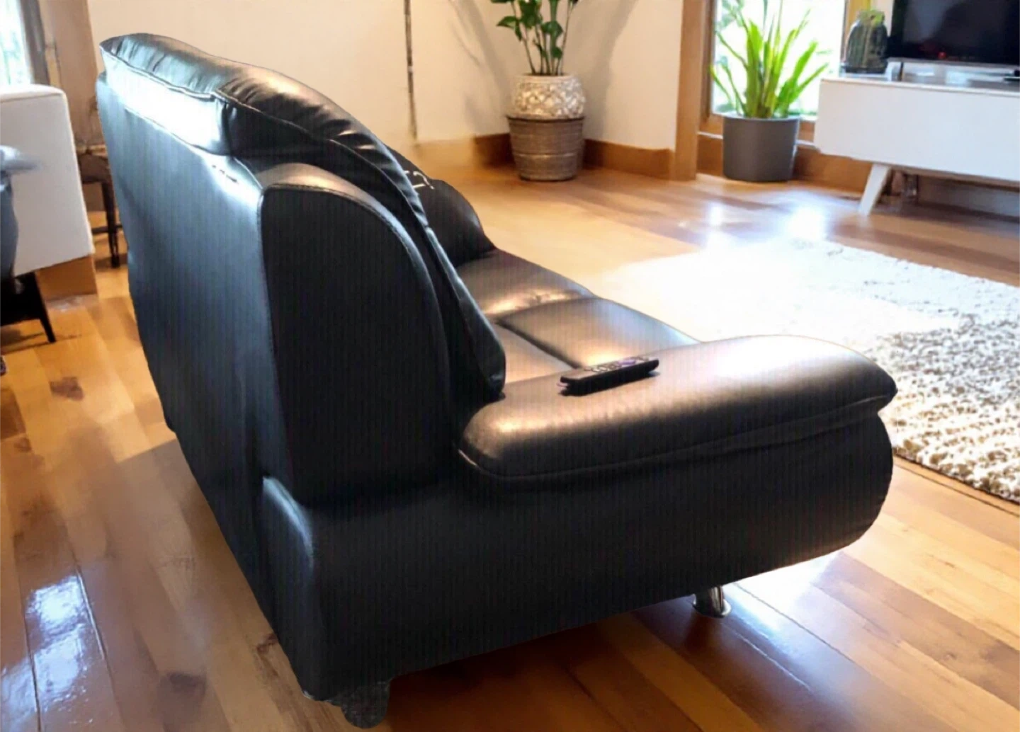 A comfortable modern black leather loveseat in great condition. This two-seater sofa is made from a durable faux leather material. It offers ample seating for two people.