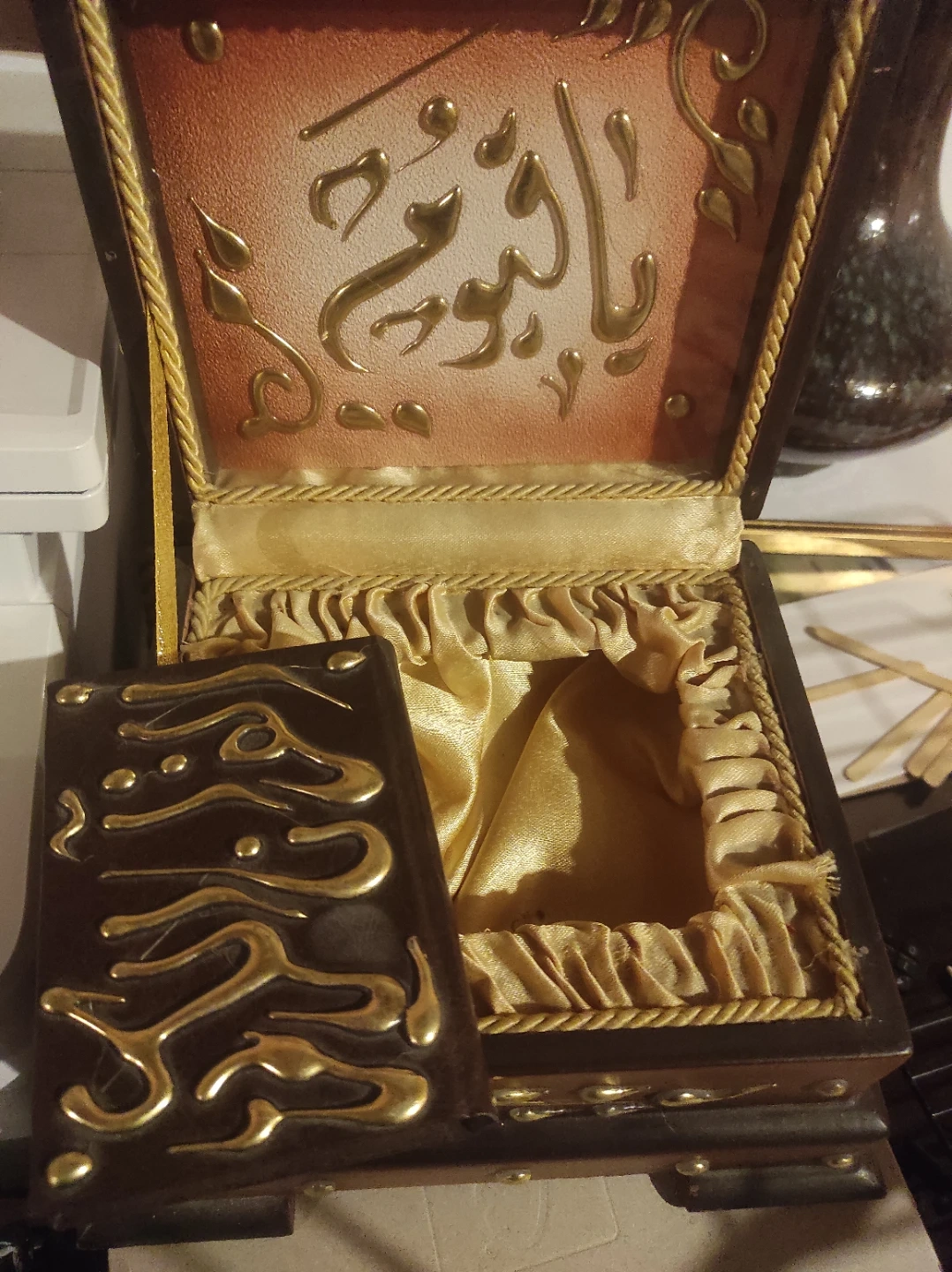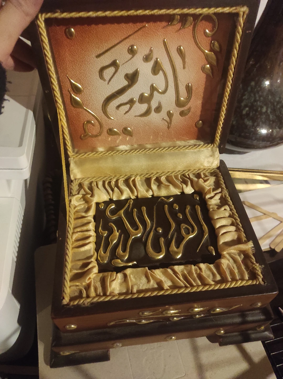 This is a beautifully crafted wooden box, designed to hold a Quran. It features ornate Arabic calligraphy on the lid and inside. The box itself is made of wood with decorative gold accents.pick up only.