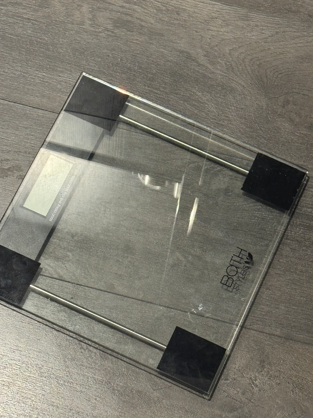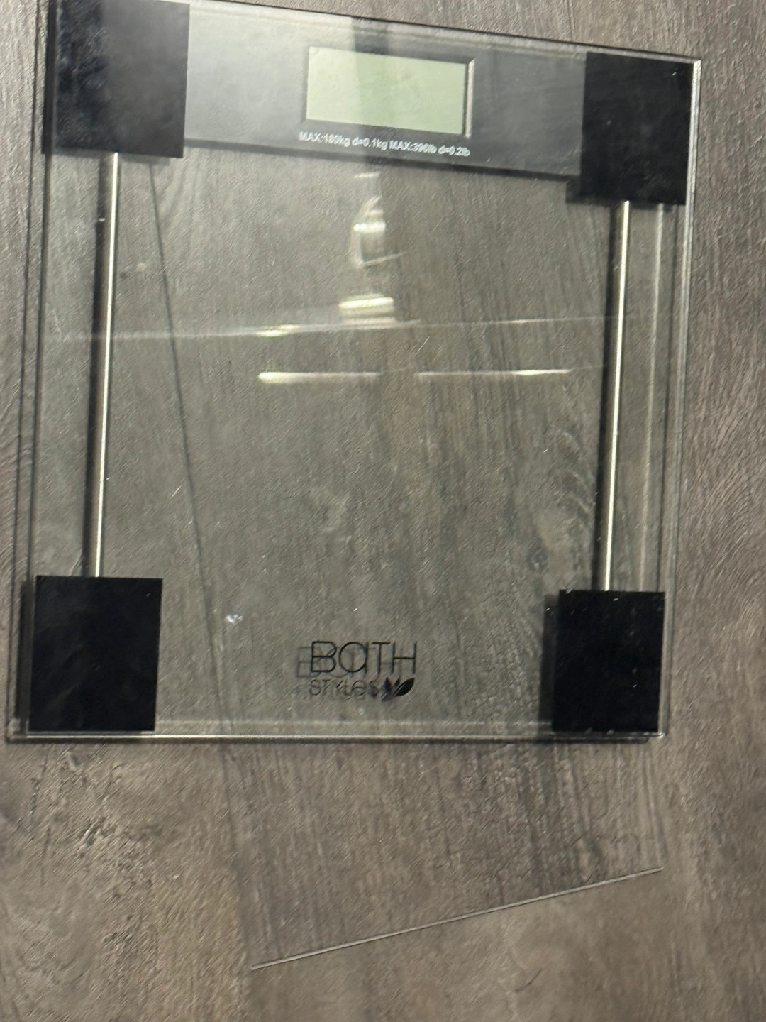 Digital bathroom scale. Glass platform. Features a digital display. Maximum weight capacity 180kg or 396 lbs.