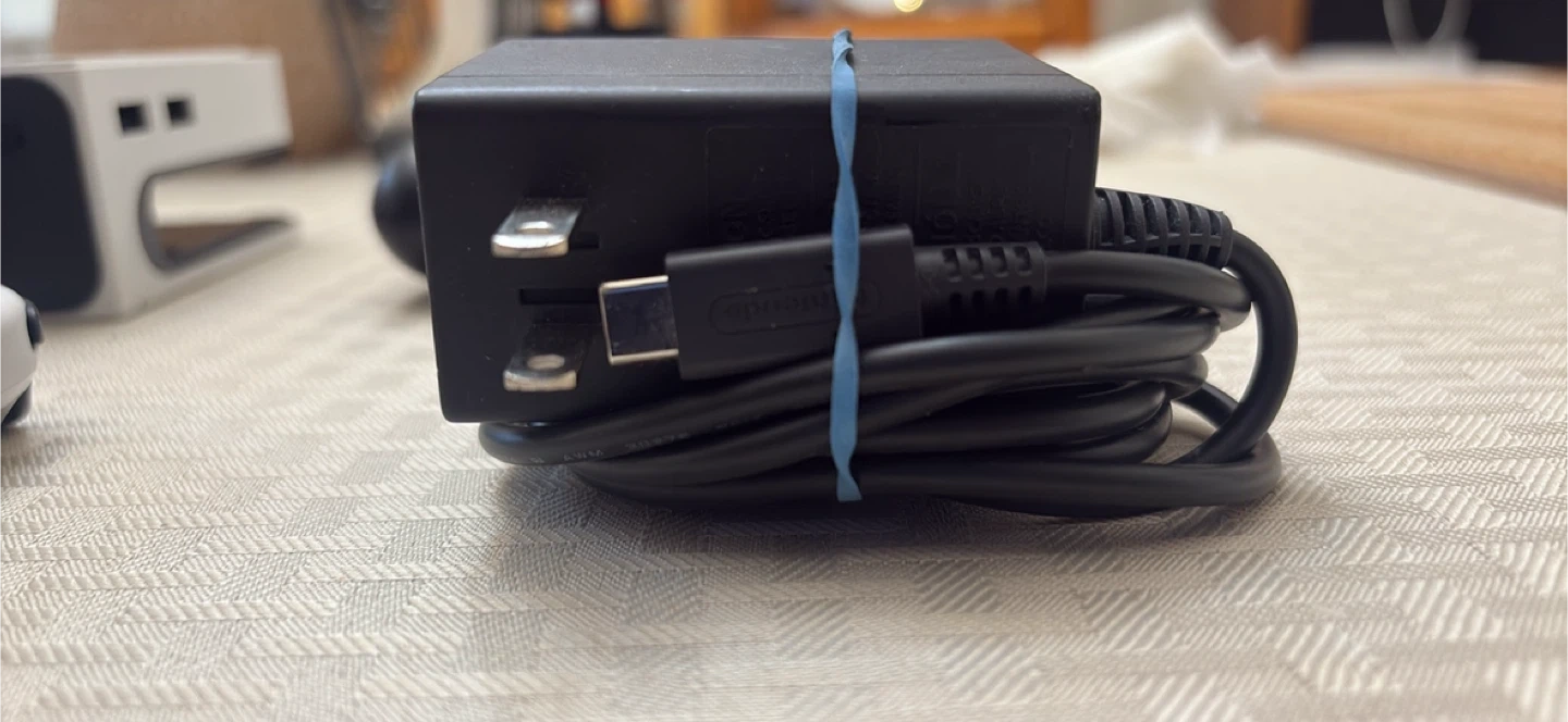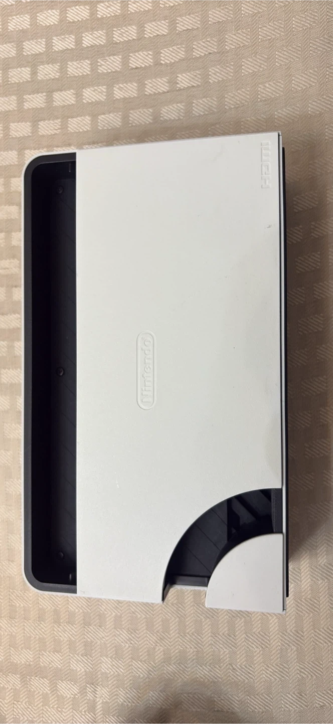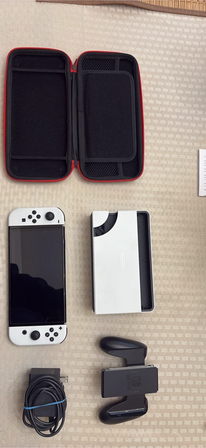 Complete Nintendo Switch OLED model in white. Includes the console, Joy-Cons, dock, grip, AC adapter, and original case. It's ready for gaming fun!
