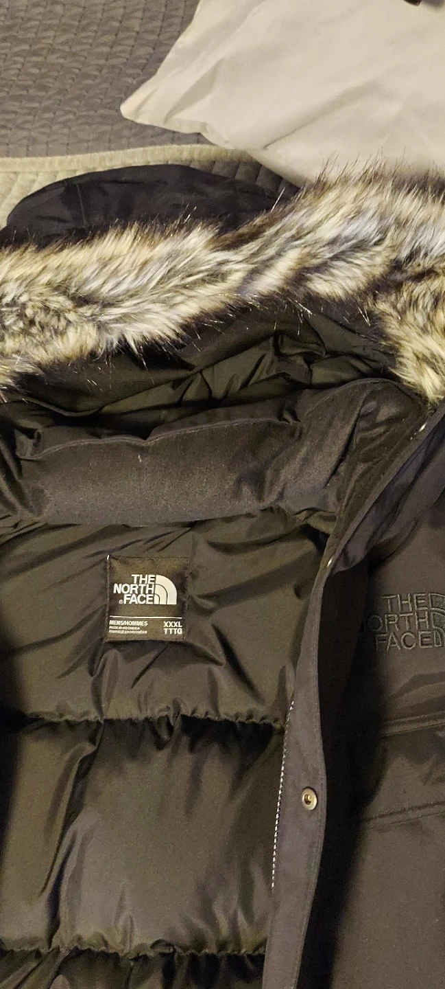 Selling a The North Face parka in size XXXL. It's a dark color, possibly black or navy. The parka features a faux fur-trimmed hood and several pockets. It's in good condition and ready for the winter weather!