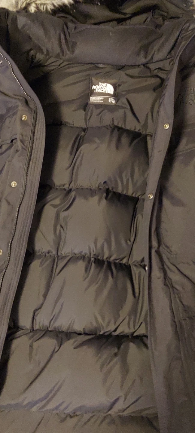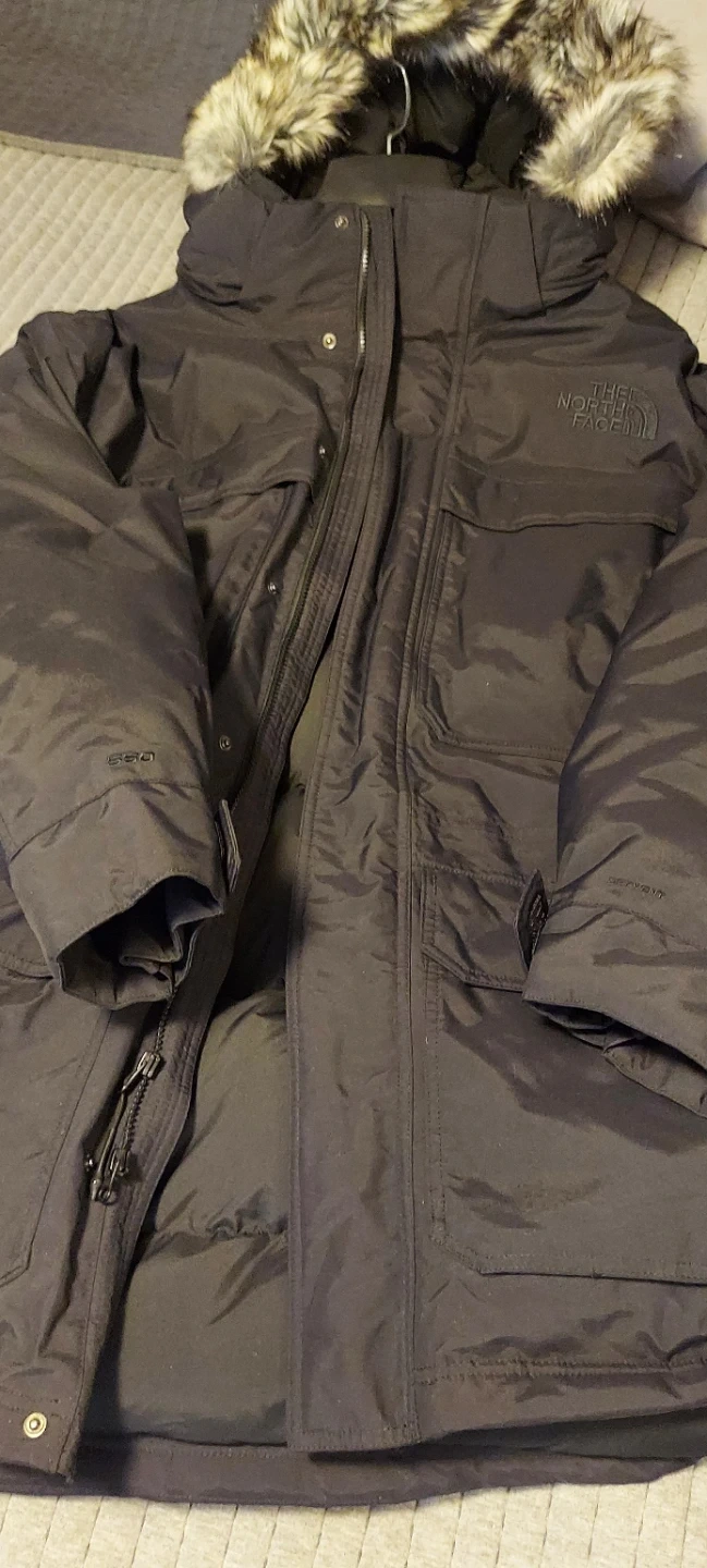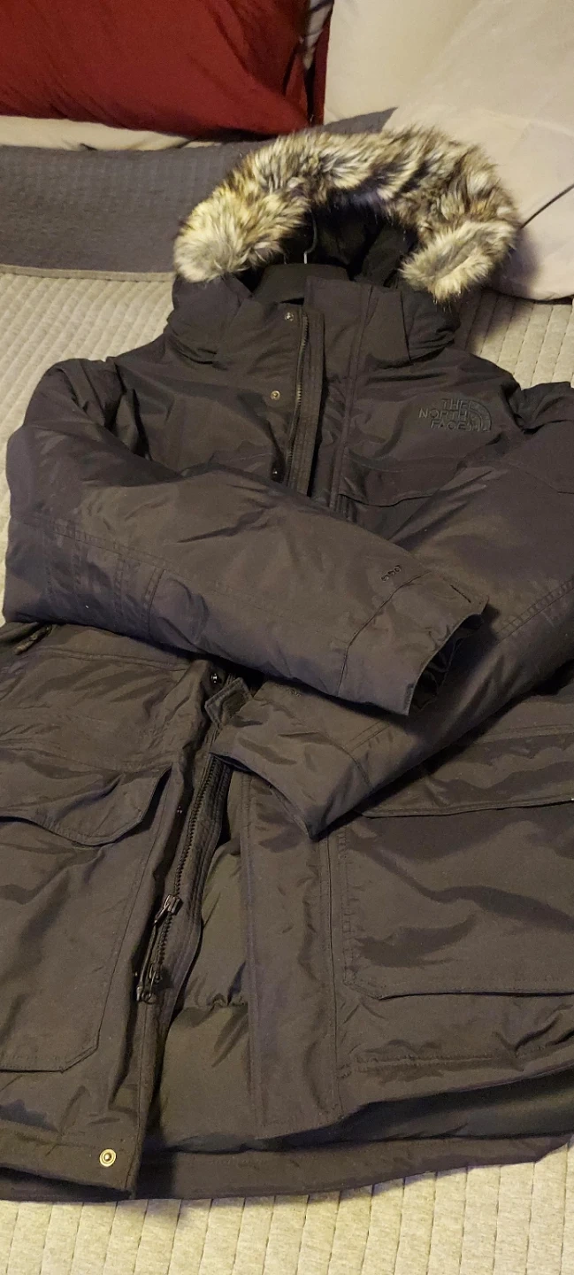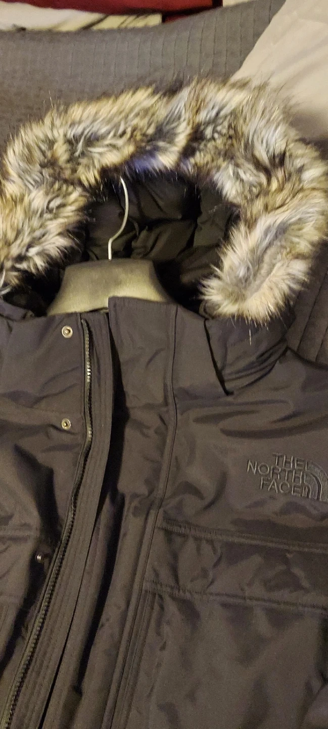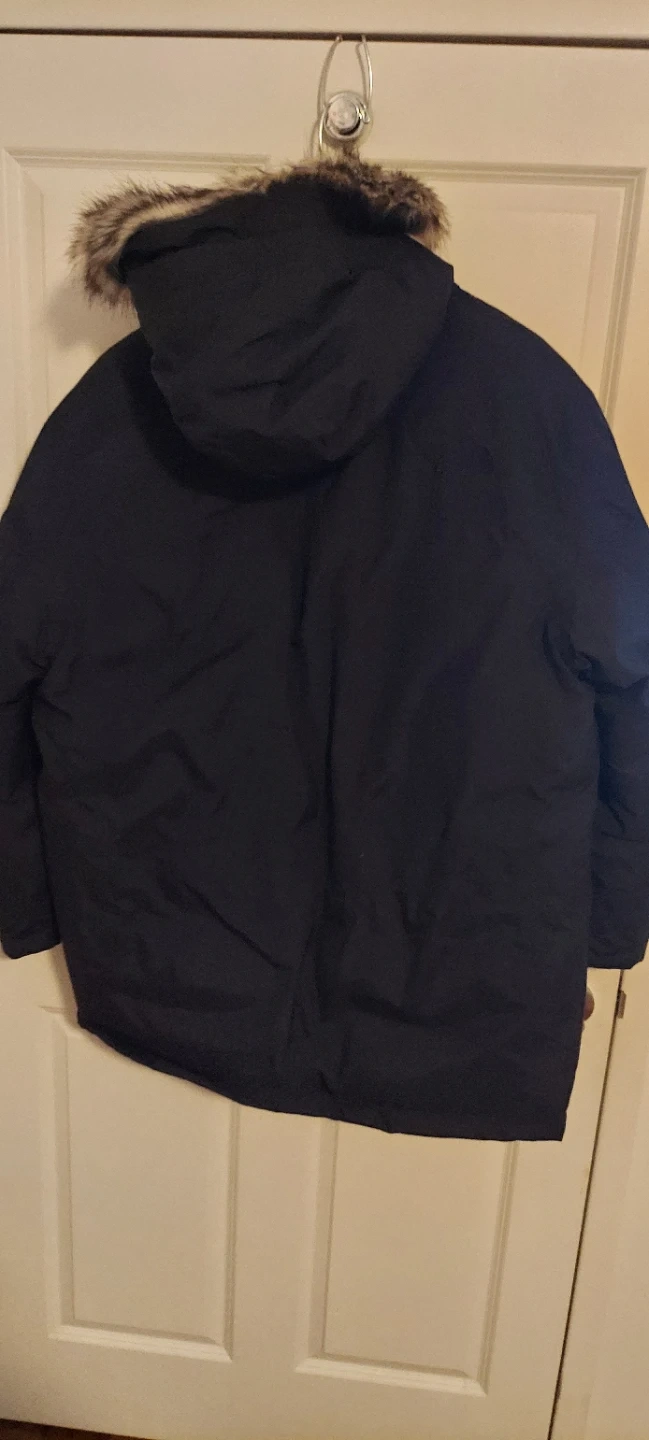 Selling a The North Face parka in size XXXL. It's a dark color, possibly black or navy. The parka features a faux fur-trimmed hood and several pockets. It's in good condition and ready for the winter weather!