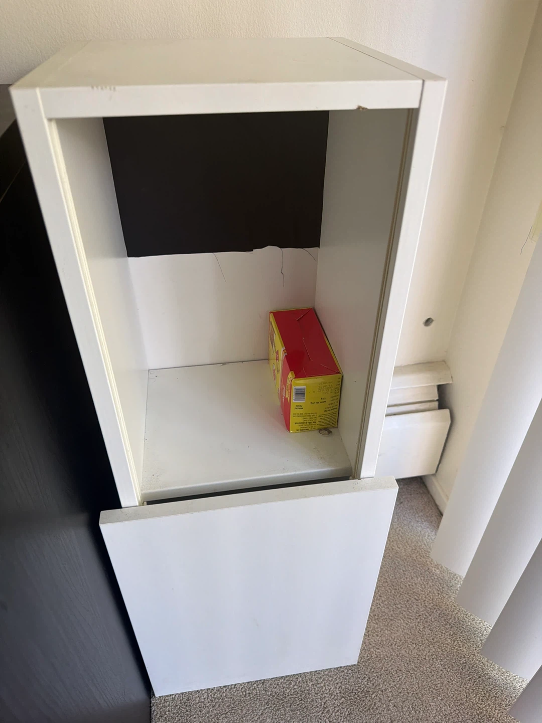 White modular storage unit with a drawer. Includes a small yellow and red box with text. Unit has some minor scuffs. Suitable for organizing small items.