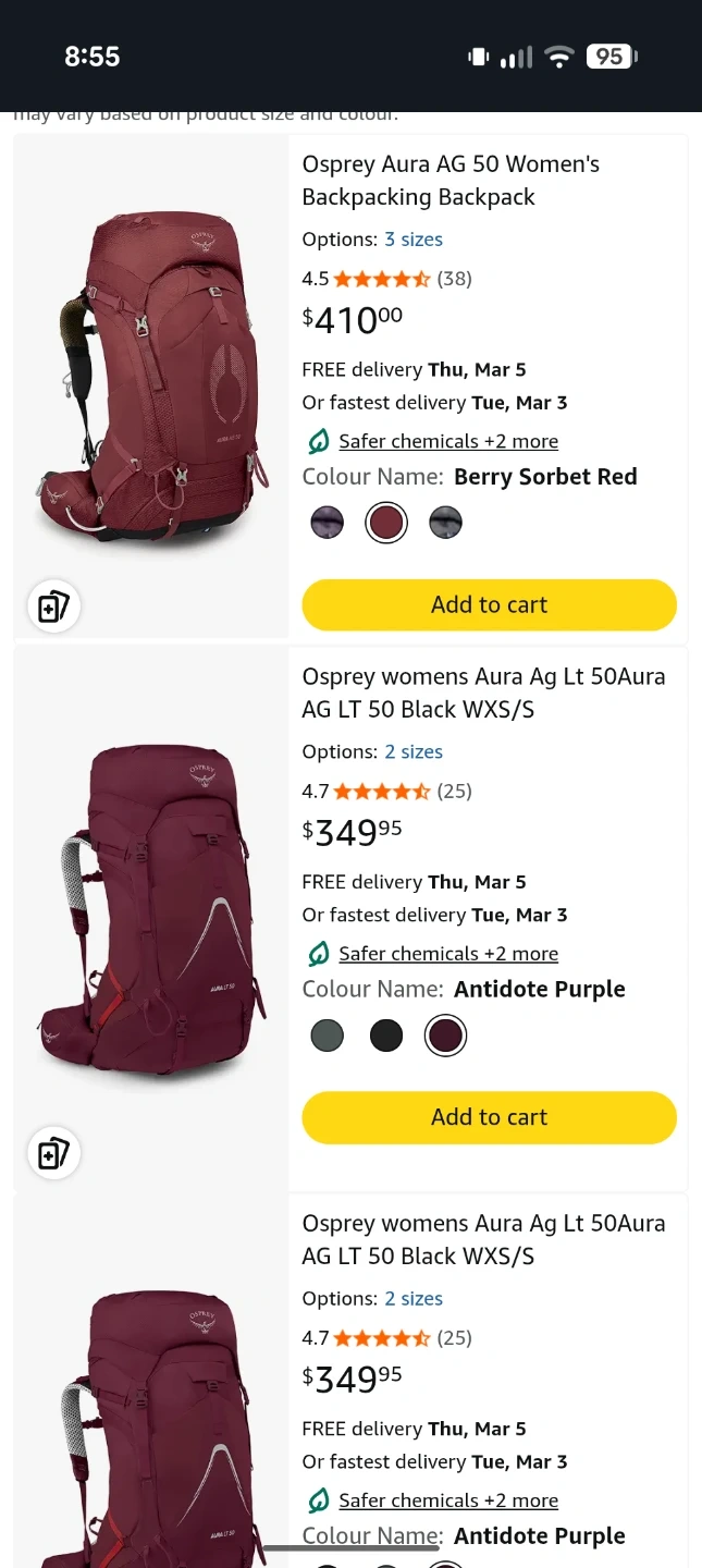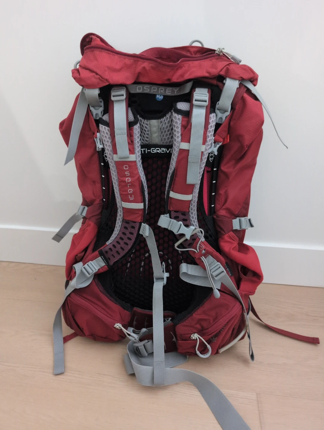 Osprey Aura AG 50 women's backpack in red. Size WXS(36-43cm). Designed with an Anti-Gravity suspension system, making it easier to carry. Comes with ultralight waterproof liner. Like new condition, used once, no longer needed.
